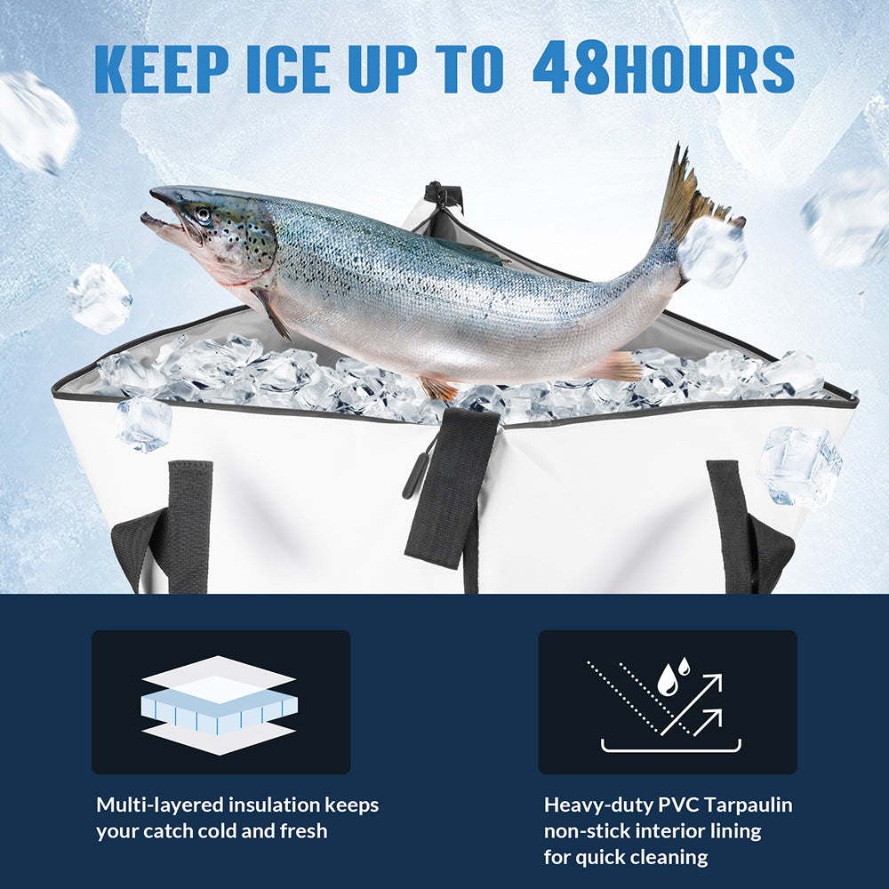 Keep Your Catch Fresh: This fish cooler bag features radio frequency welded seams, double insulation, and 60mm insulation cotton, ensuring premium insulation and leak-proof performance. It includes two reusable insulated ice packs that maintain the freshness of your catch for up to 48 hours, or even longer with additional ice. Ideal for both sea and lake fishing trips.