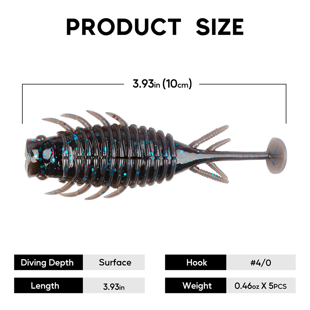 Multi-Purpose Application: This soft bait is versatile and suitable for various rig setups such as Texas rigs, Carolina rigs, and jig rigs. Its fluted back design and crank hook combo excel in navigating through underwater obstacles, making it effective for bass, pike, catfish, muskies, and more.