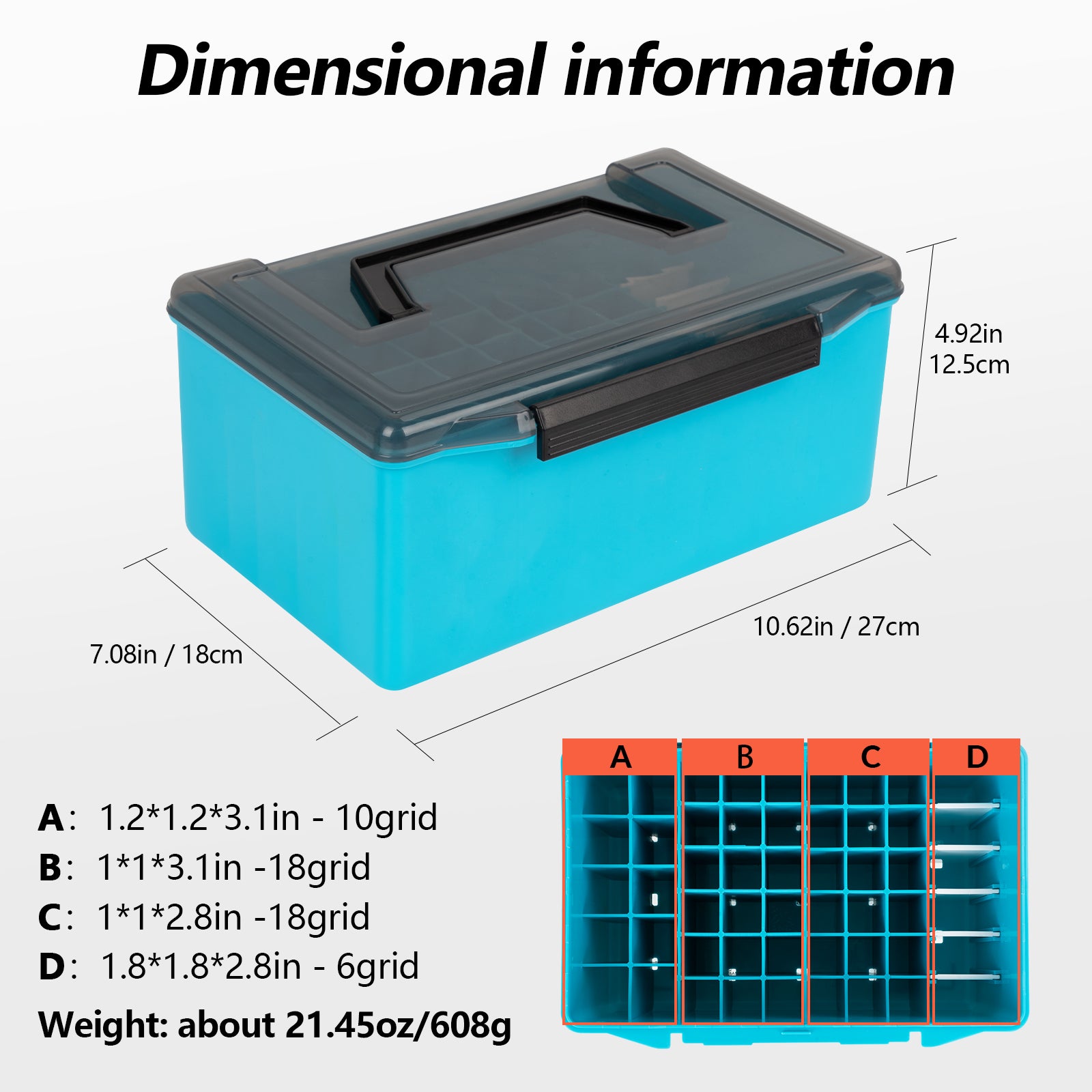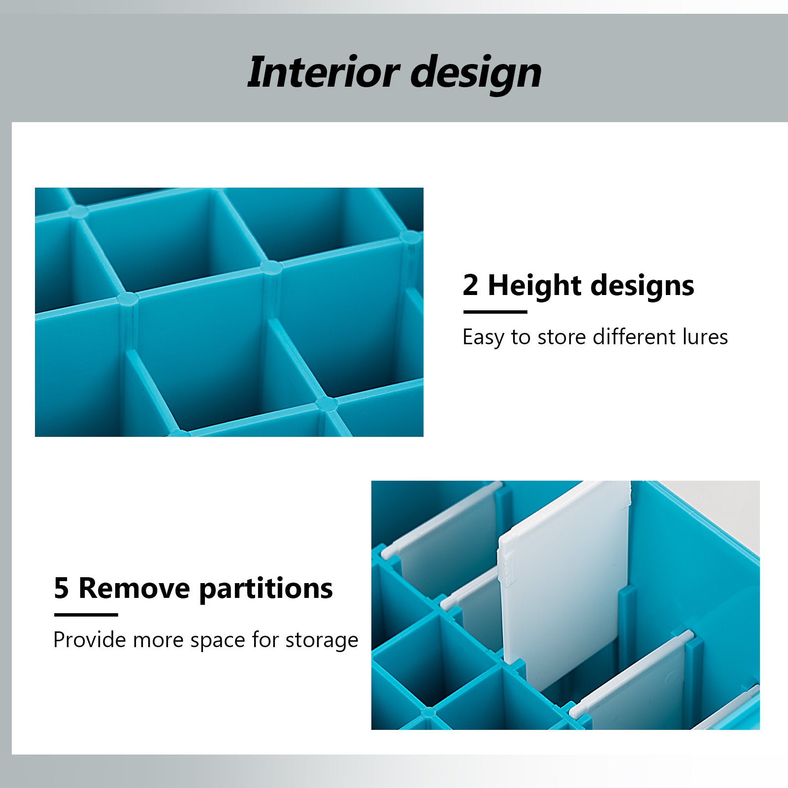 Internal Details: The internal grid of the bait box can be divided into 4 areas of different sizes, making it easy to store and organize baits of various sizes. Designed with 2 height levels, it can accommodate baits up to 4.6 inches long. Additionally, there are 5 detachable partitions on the far right side, providing flexibility and convenience for adjusting the layout according to your needs.
