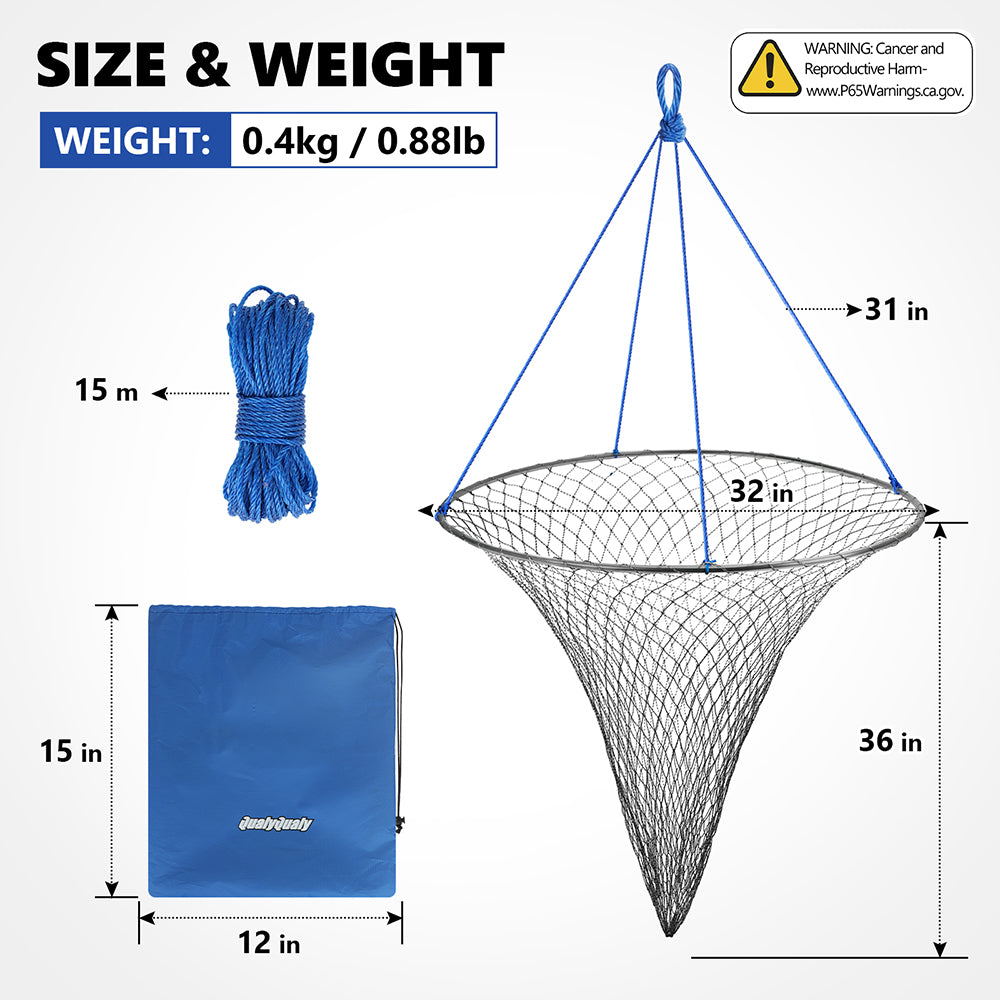 Collapsible Design: The hoop of this fishing net is constructed with flexible stainless steel, allowing it to be folded from a 32-inch large hoop into a compact 12-inch size. It comes with a storage bag for convenient transportation.