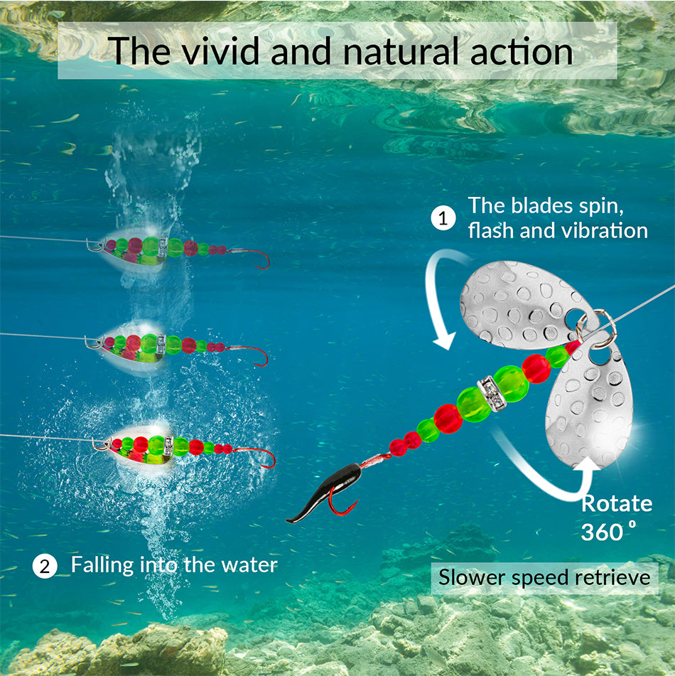 Vivid Swimming Action: Crafted with precision, these fishing spinner rigs exhibit a natural and unique swimming action underwater. The metal blades reflect light, enticing fish to attack. Their lifelike swimming actions make them irresistible to kokanee, walleye, and other species.