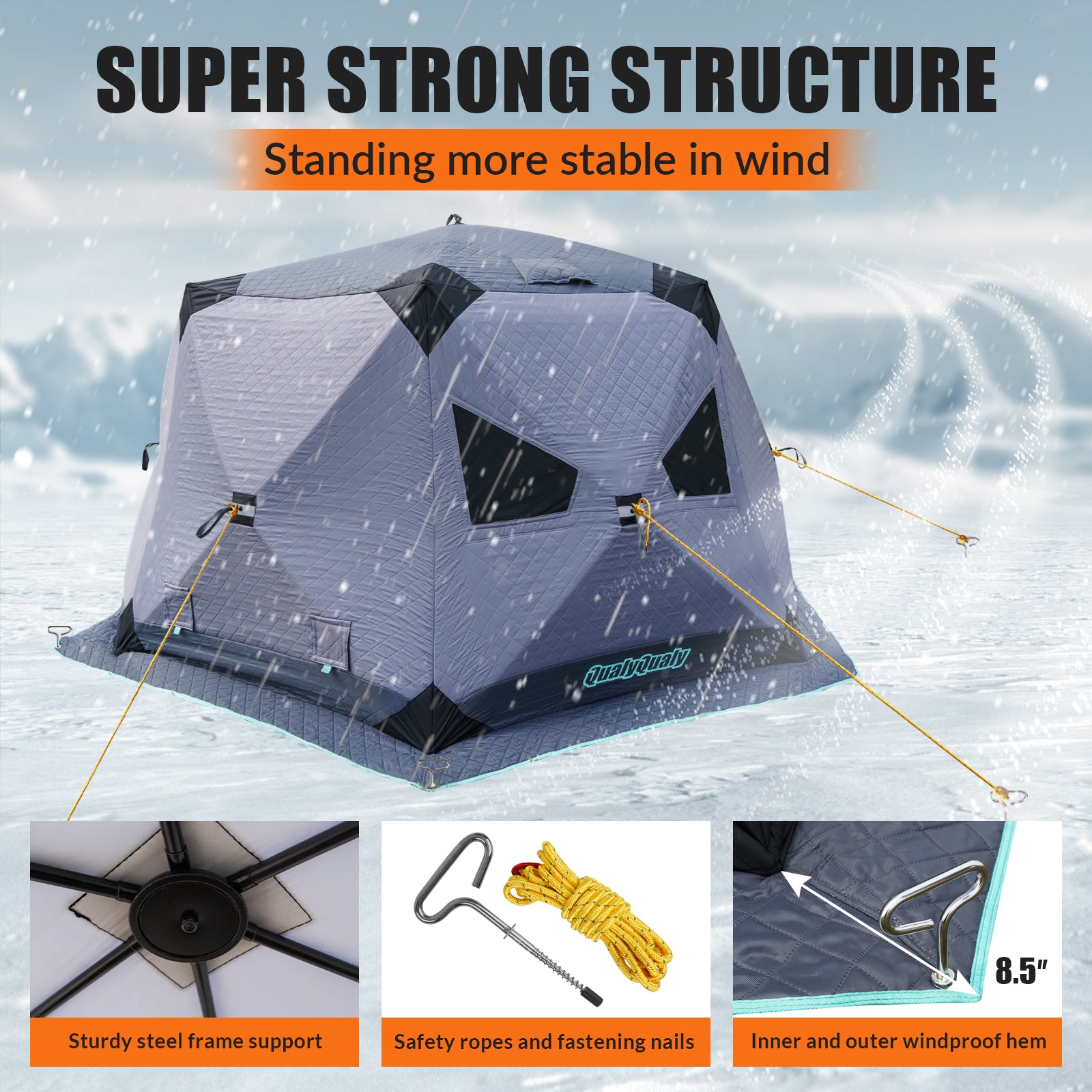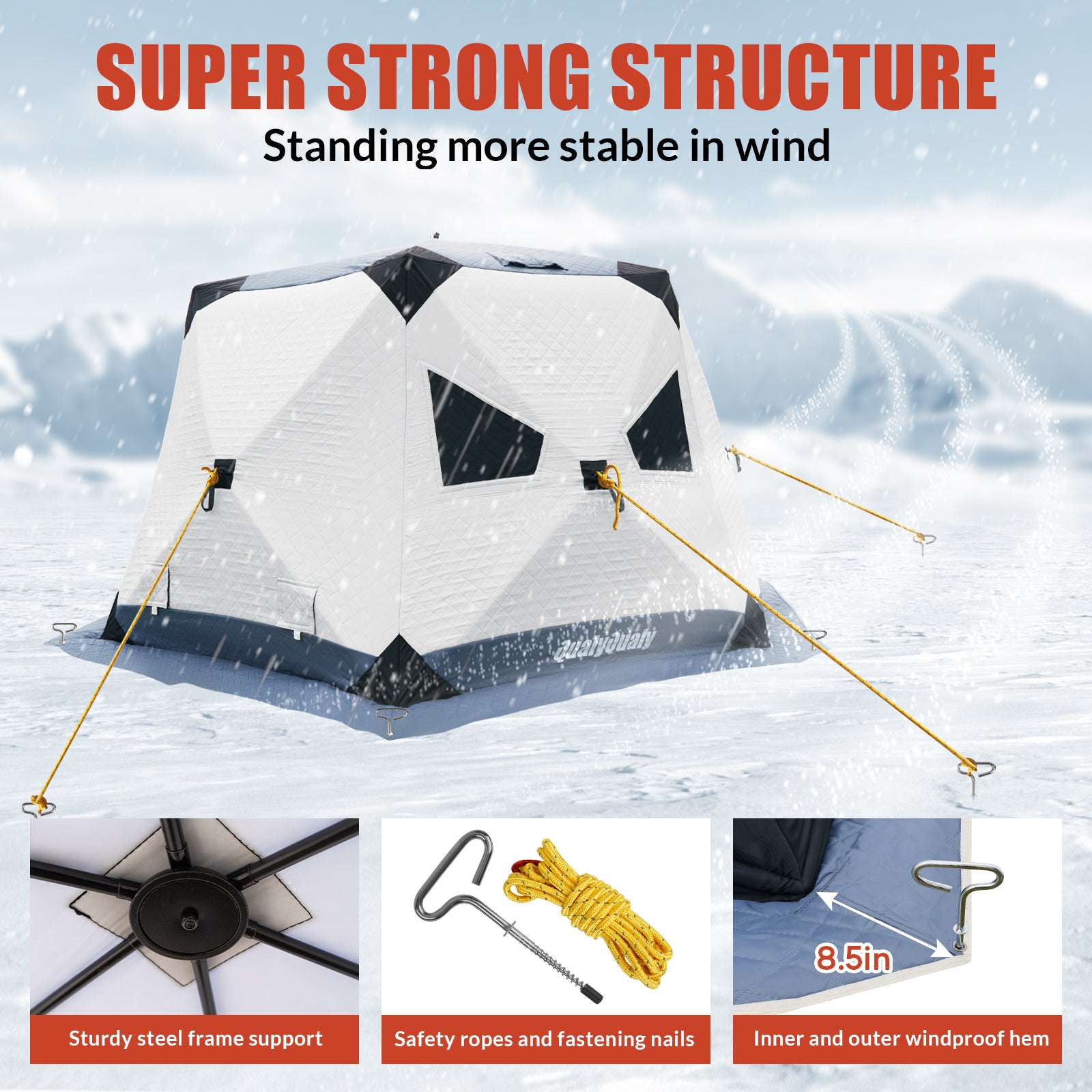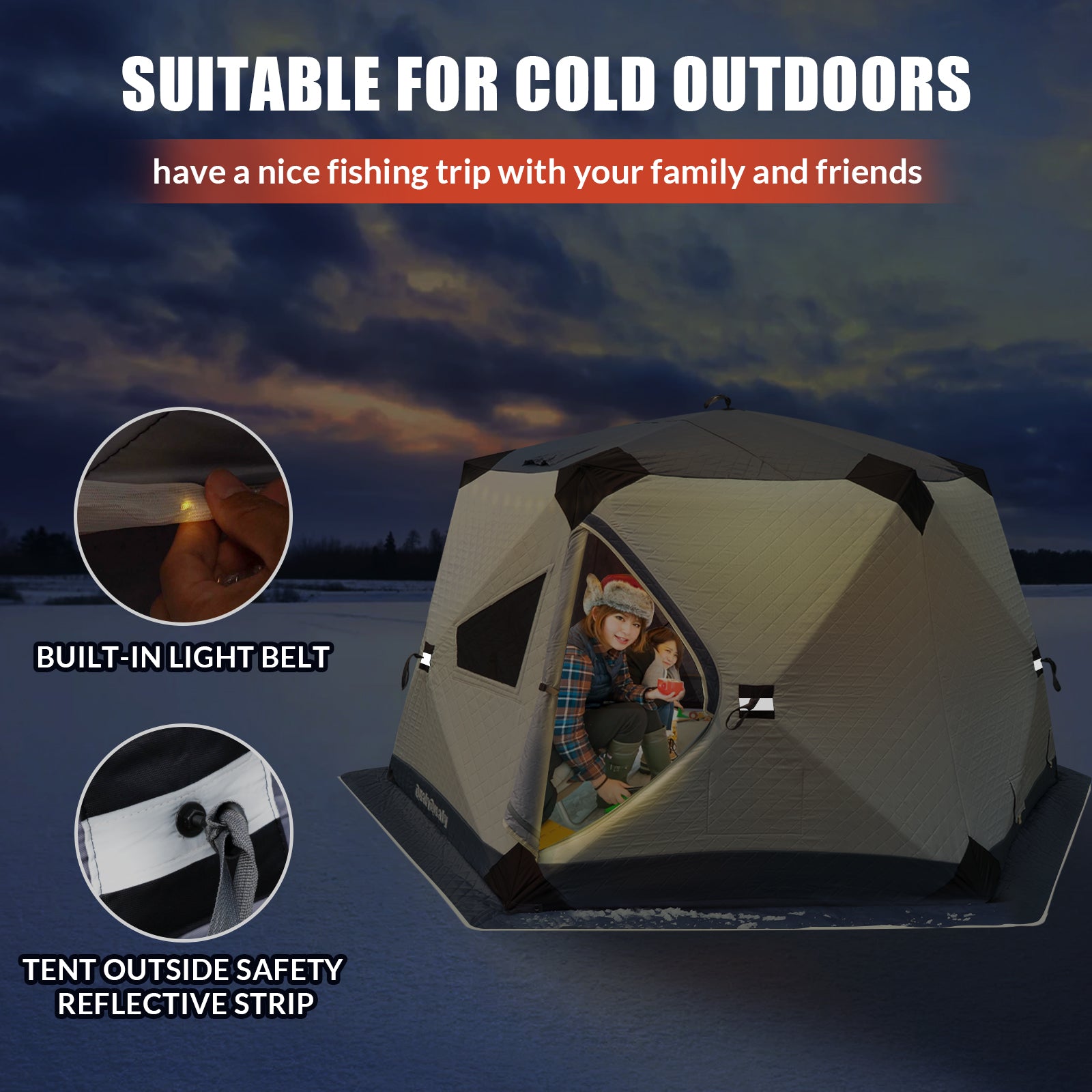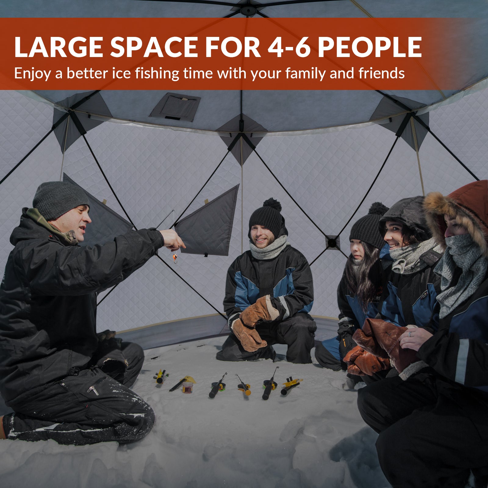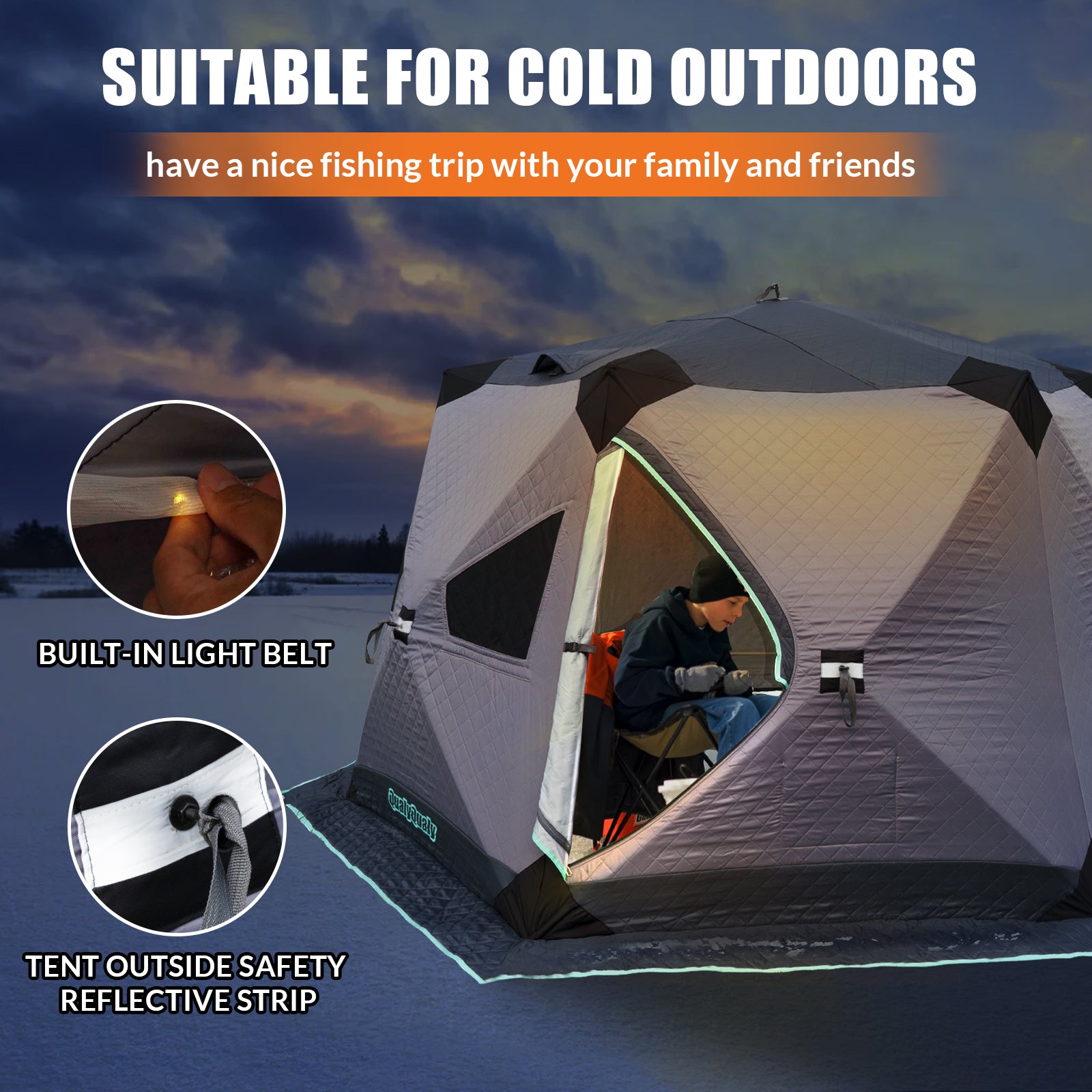 The 4-6 Person Portable Ice Fishing Tent Shelter is designed for anglers seeking a warm and spacious environment during their fishing trips. With its convenient pop-up design and superior insulation, this ice fishing tent ensures comfort and protection from the elements, making it perfect for both fishing and camping.