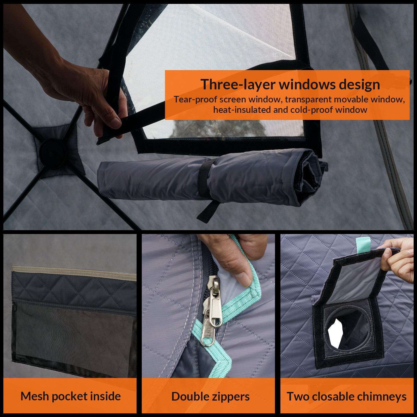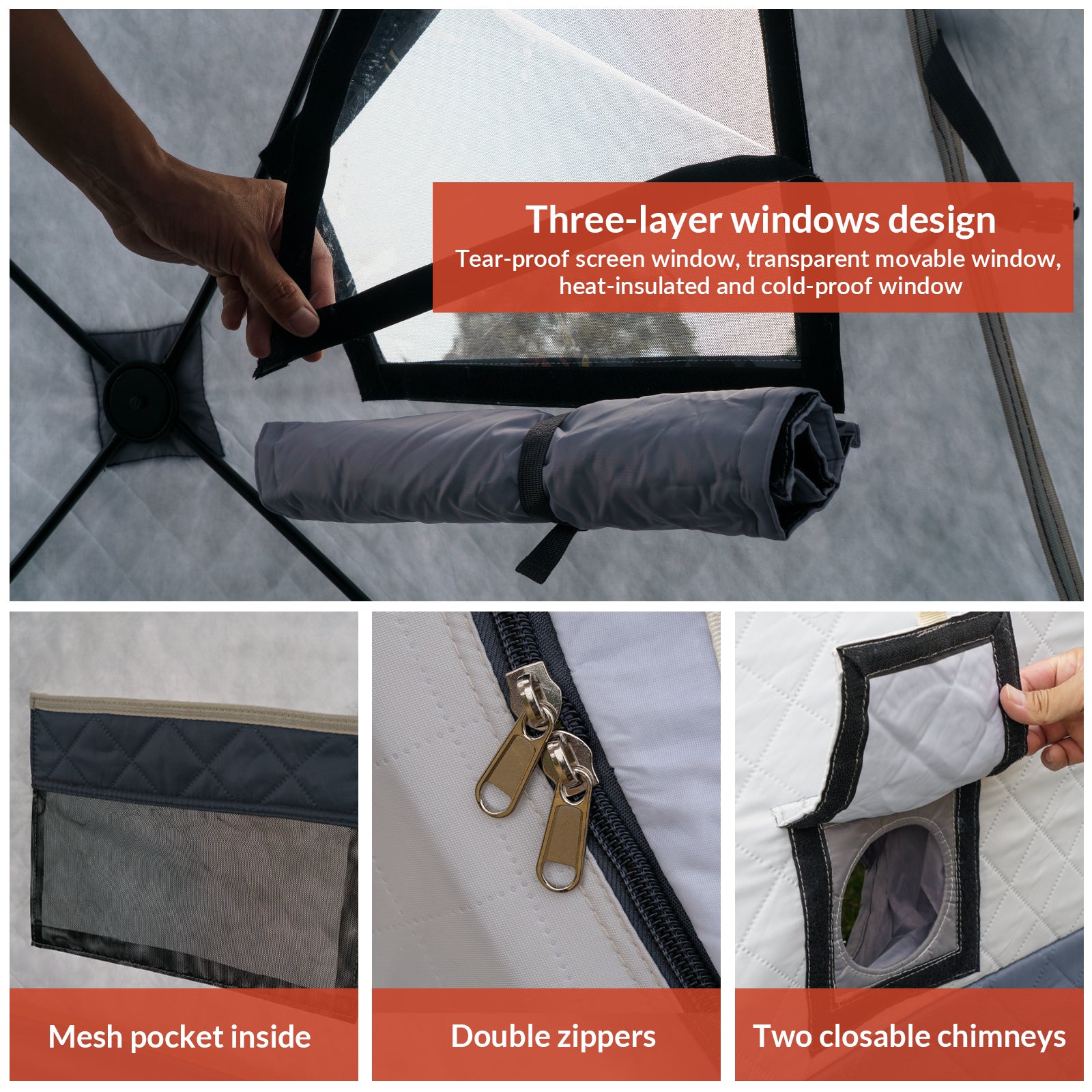 - Optimal Lighting and Ventilation: The tent features 4 three-layer mesh windows with removable PVC windows and insulated covers, providing adjustable light and ventilation. The air vent design maximizes warmth and airflow, ensuring a comfortable environment inside.