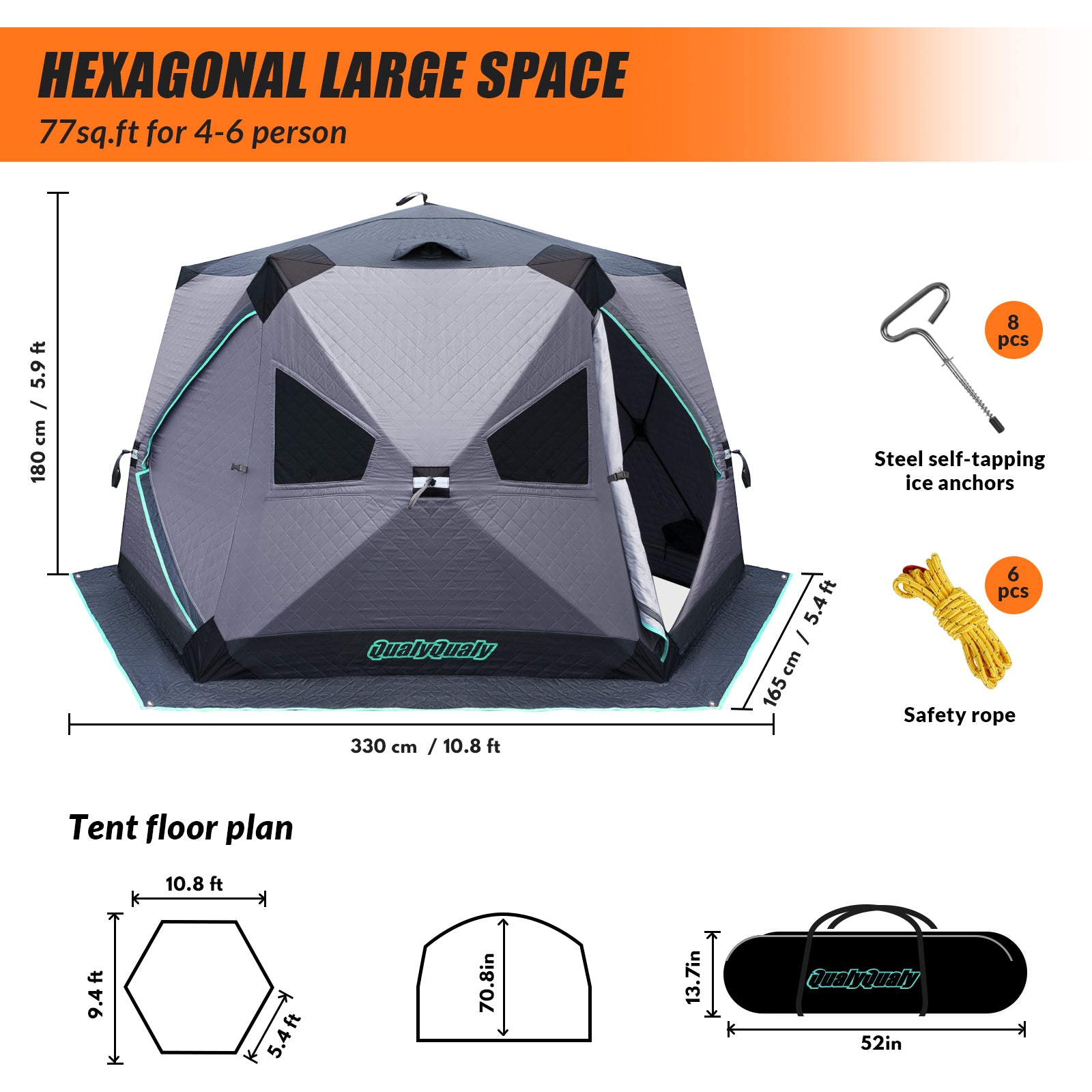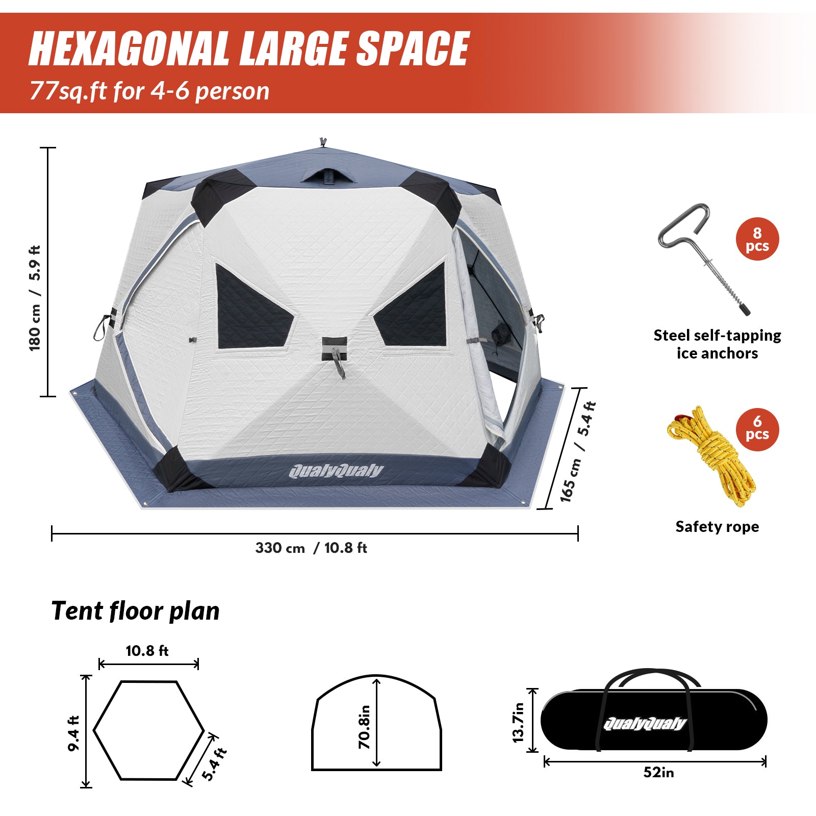 - Spacious and Convenient Design: This pop-up ice fishing shelter, weighing just 42 pounds, can be effortlessly set up and taken down by a single person. With dimensions of 10.8 x 9.3 x 5.9 ft., the 77 sq. ft. fishable area comfortably accommodates 4-6 people. Ideal for fishing or camping, the tent comes equipped with essential accessories, including 8 cross-recessed countersunk head tapping screws, 6 fixing ropes, and 1 portable storage bag.