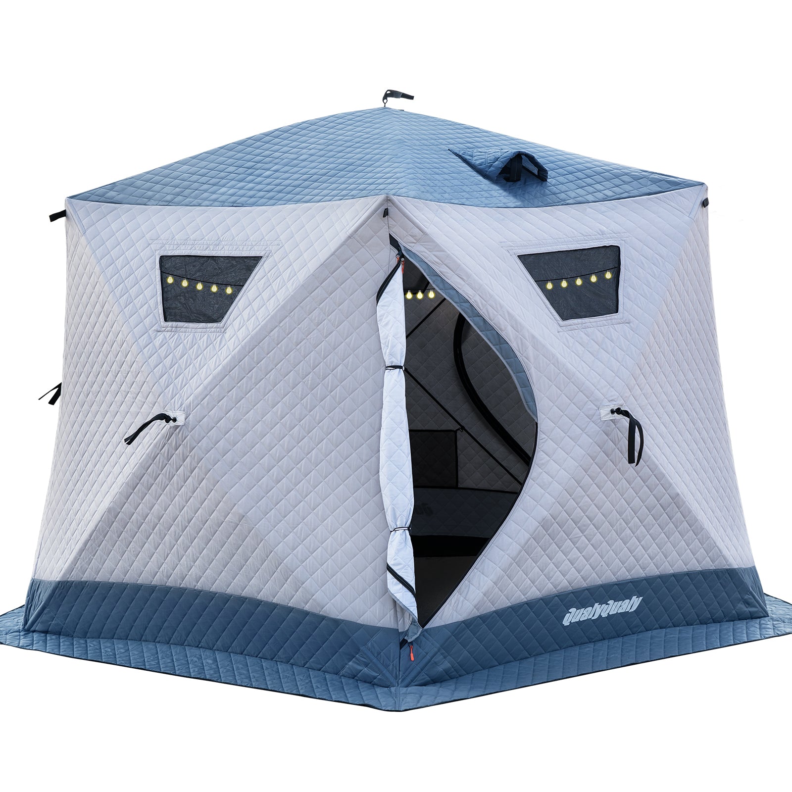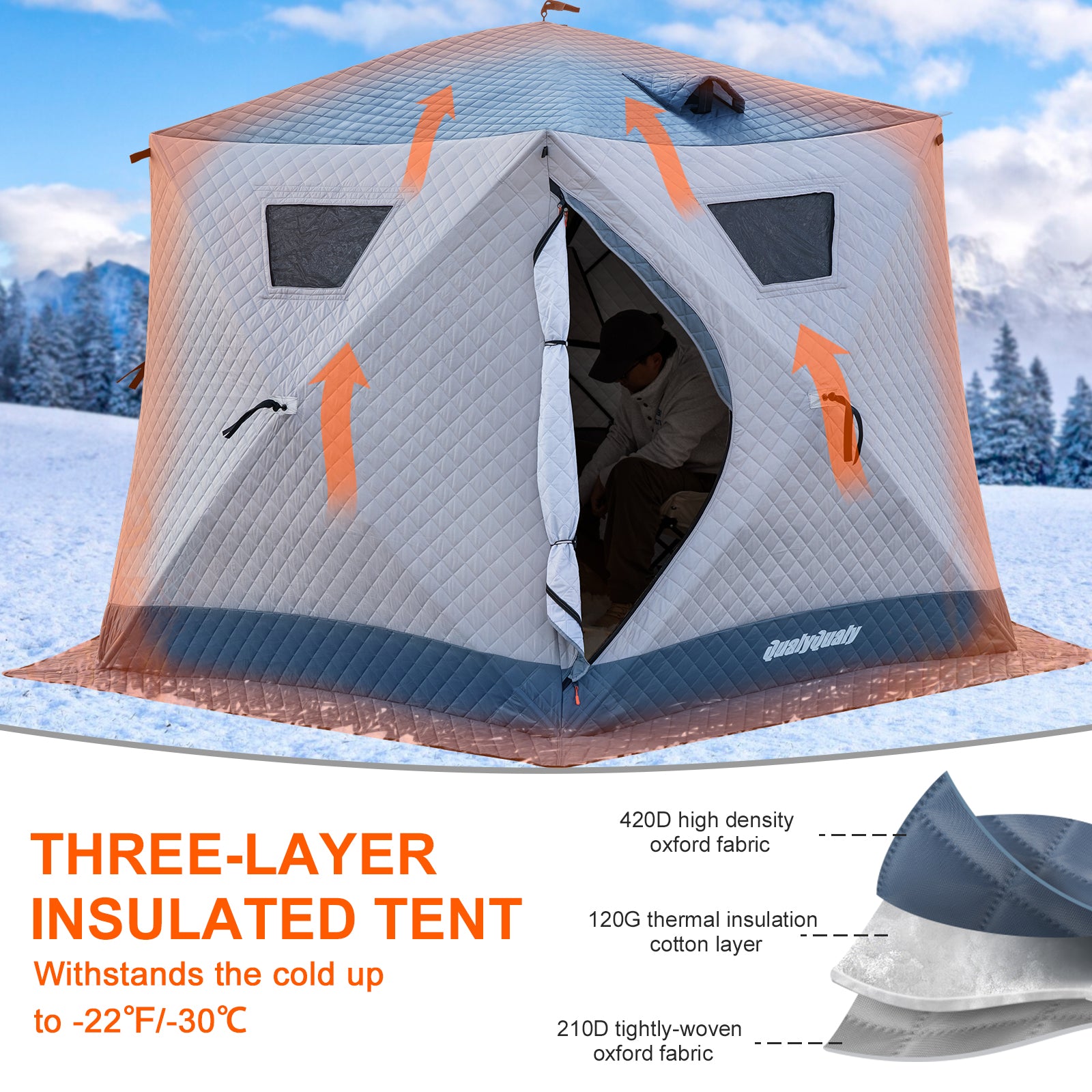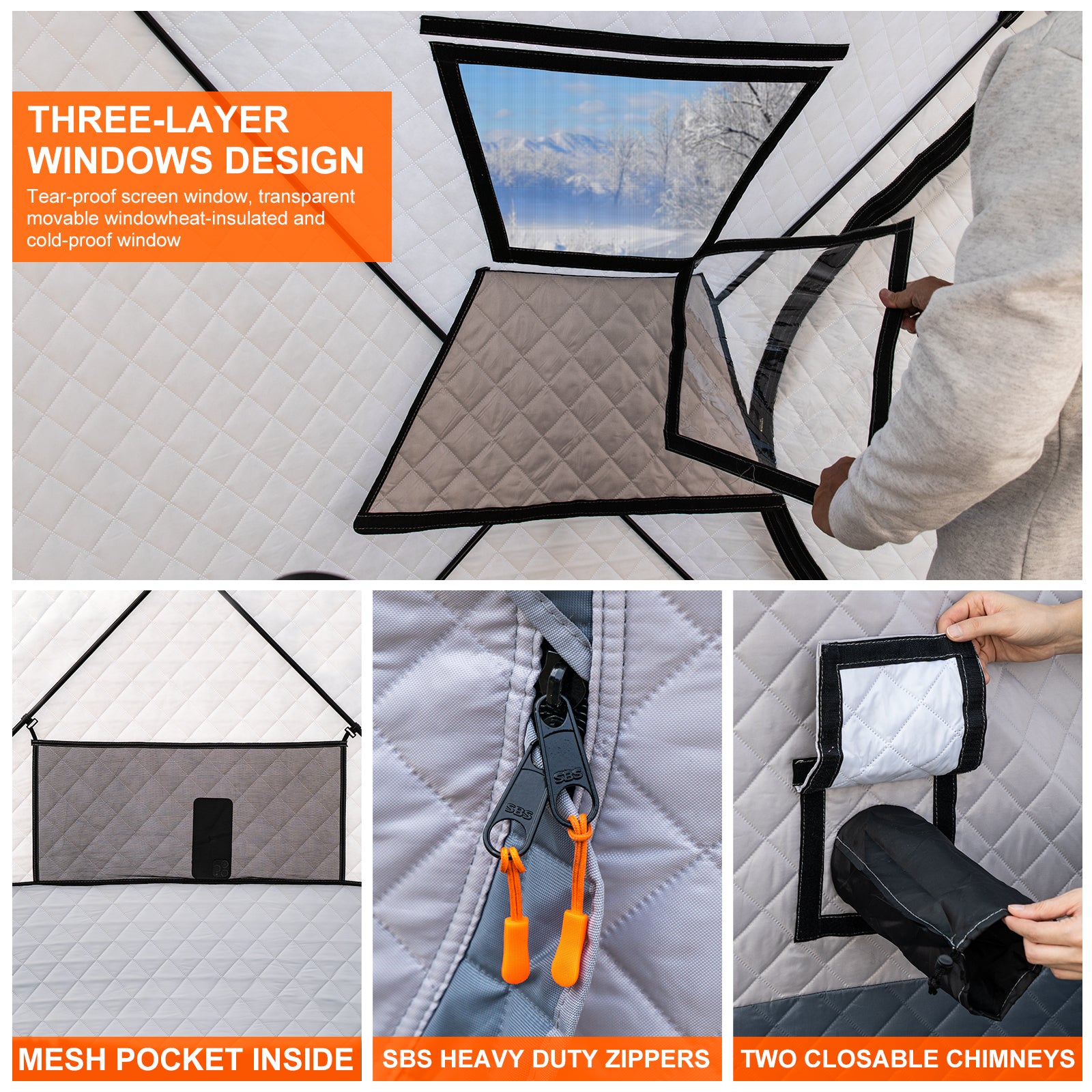 - User-Friendly Details: Features 2 doors, 2 ventilated windows with insulated covers, and 4 storage net bags. The triple-pane removable windows offer adjustable light and ventilation. SBS heavy-duty zippers ensure durability and flexibility in cold weather.
