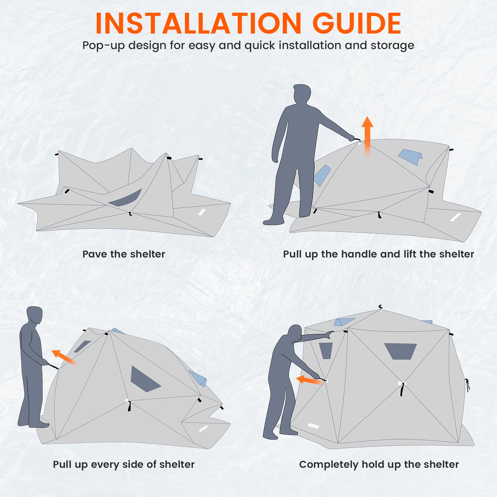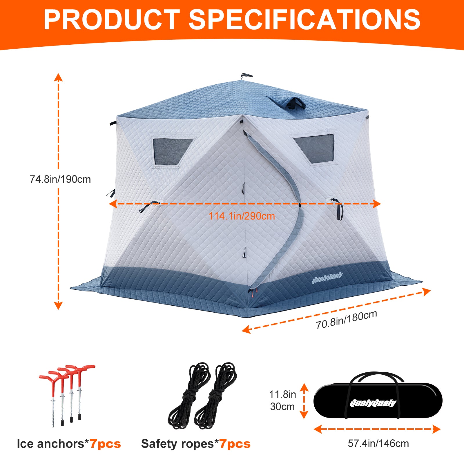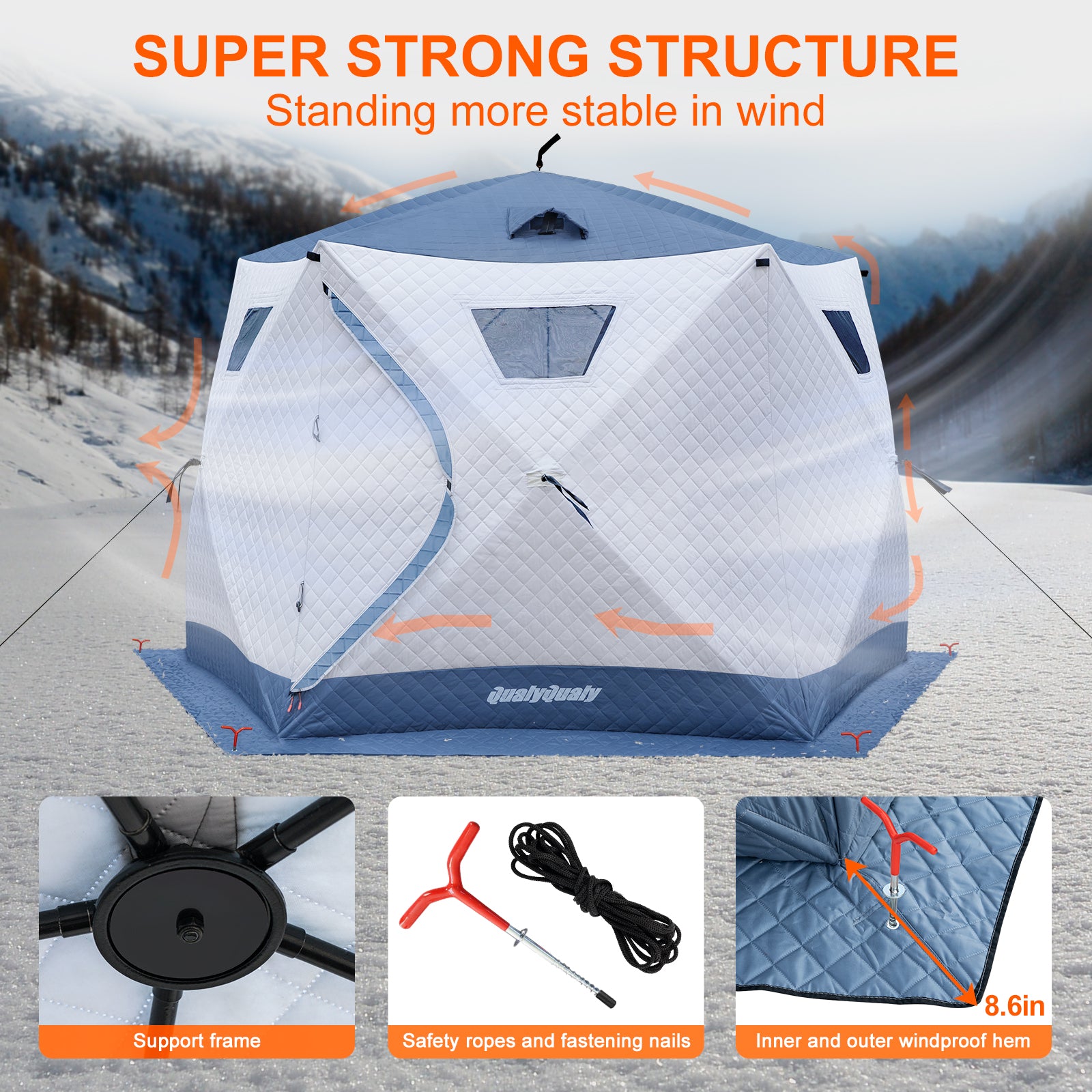 - User-Friendly Details: Features 2 doors, 2 ventilated windows with insulated covers, and 4 storage net bags. The triple-pane removable windows offer adjustable light and ventilation. SBS heavy-duty zippers ensure durability and flexibility in cold weather.
