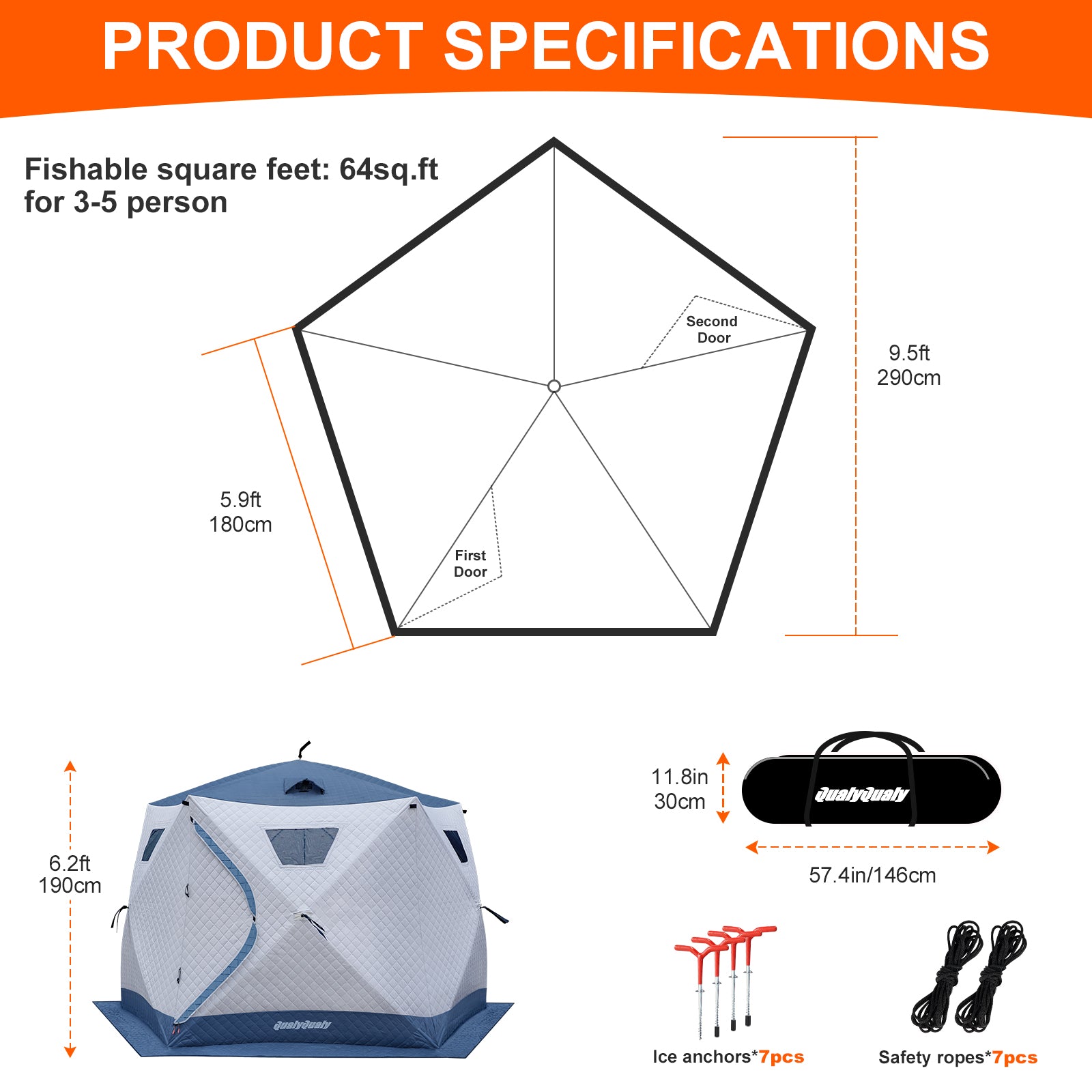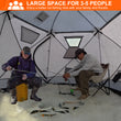 - Spacious 5-Sided Design: With a 64 sq.ft fishable area, this tent comfortably accommodates 4-5 people. The 5-sided design offers more space and stability compared to traditional 4-sided tents.