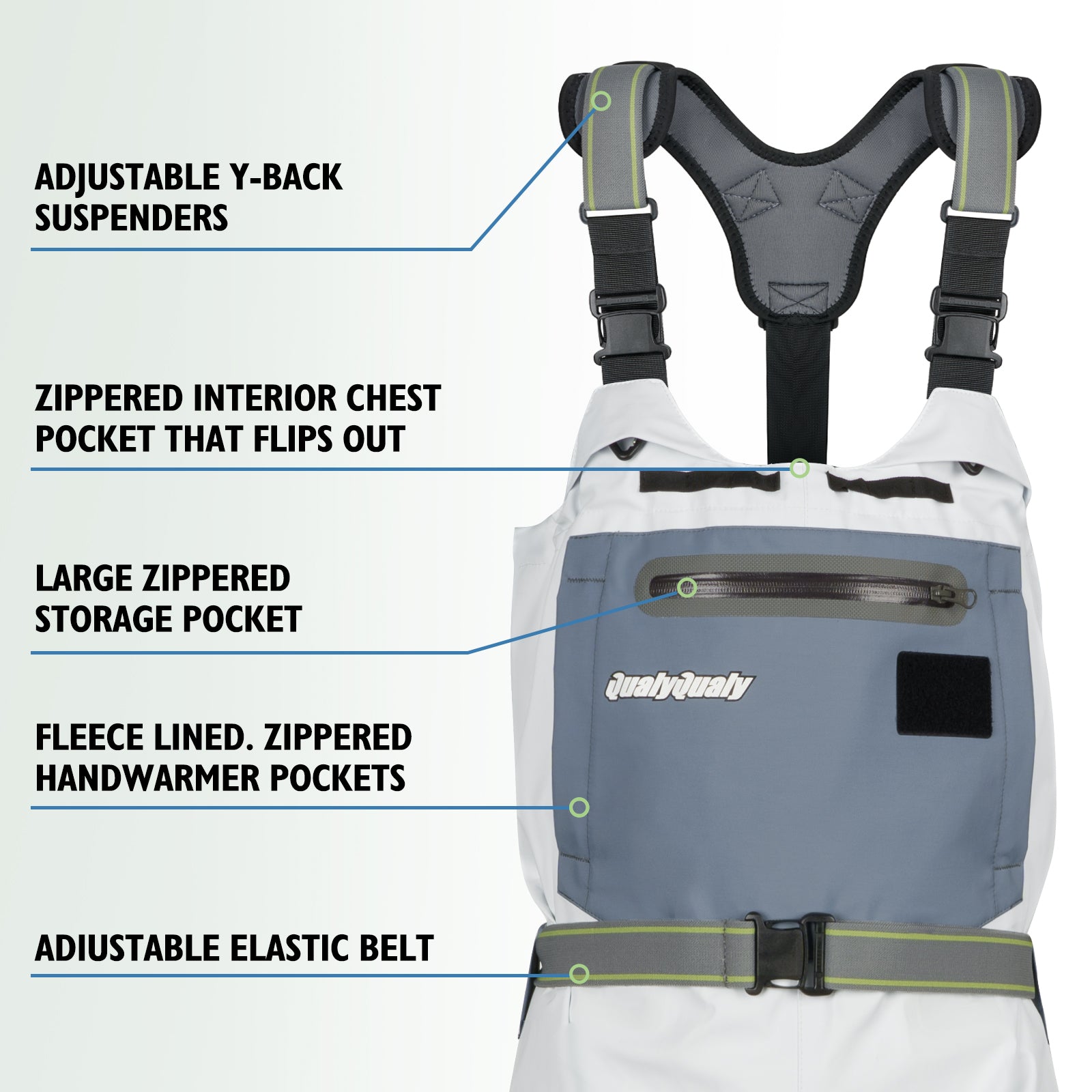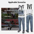 Extra Fishing Accessories: This fishing waders set includes a waterproof phone case, integrated fly patch, and foam rig keeper for storing your fishing essentials securely.
