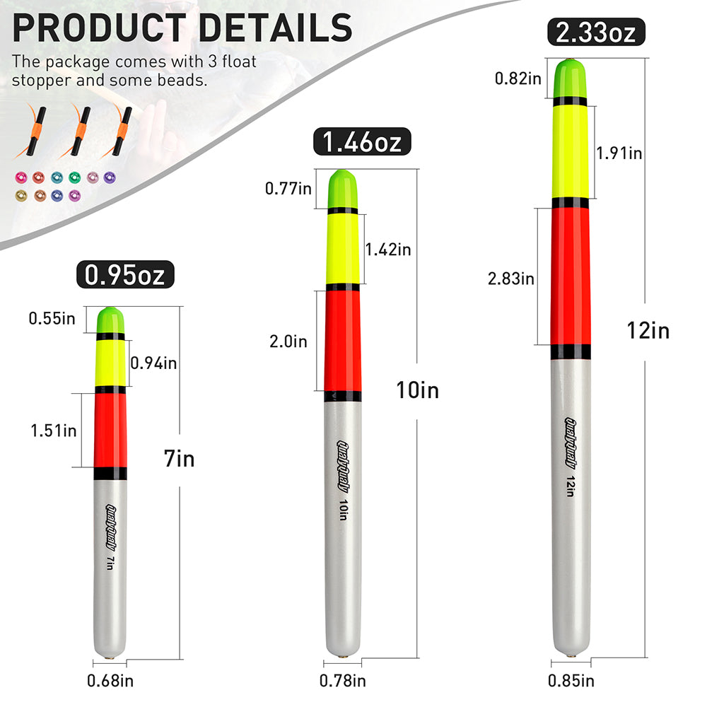 Package Includes: Each pack contains 3 slip floats, 3 adjustable string bobber stops, and 10 beads. Available in three sizes: 7in, 10in, and 12in, catering to various fishing needs and preferences.