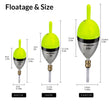 Versatile Two Removable Brass Weights: Equipped with two brass weights totaling 1/8oz (3.5g), these bobbers ensure vertical positioning in the water. Adjust depth easily by adding or removing weights, preventing snags around underwater structures.