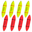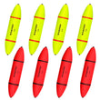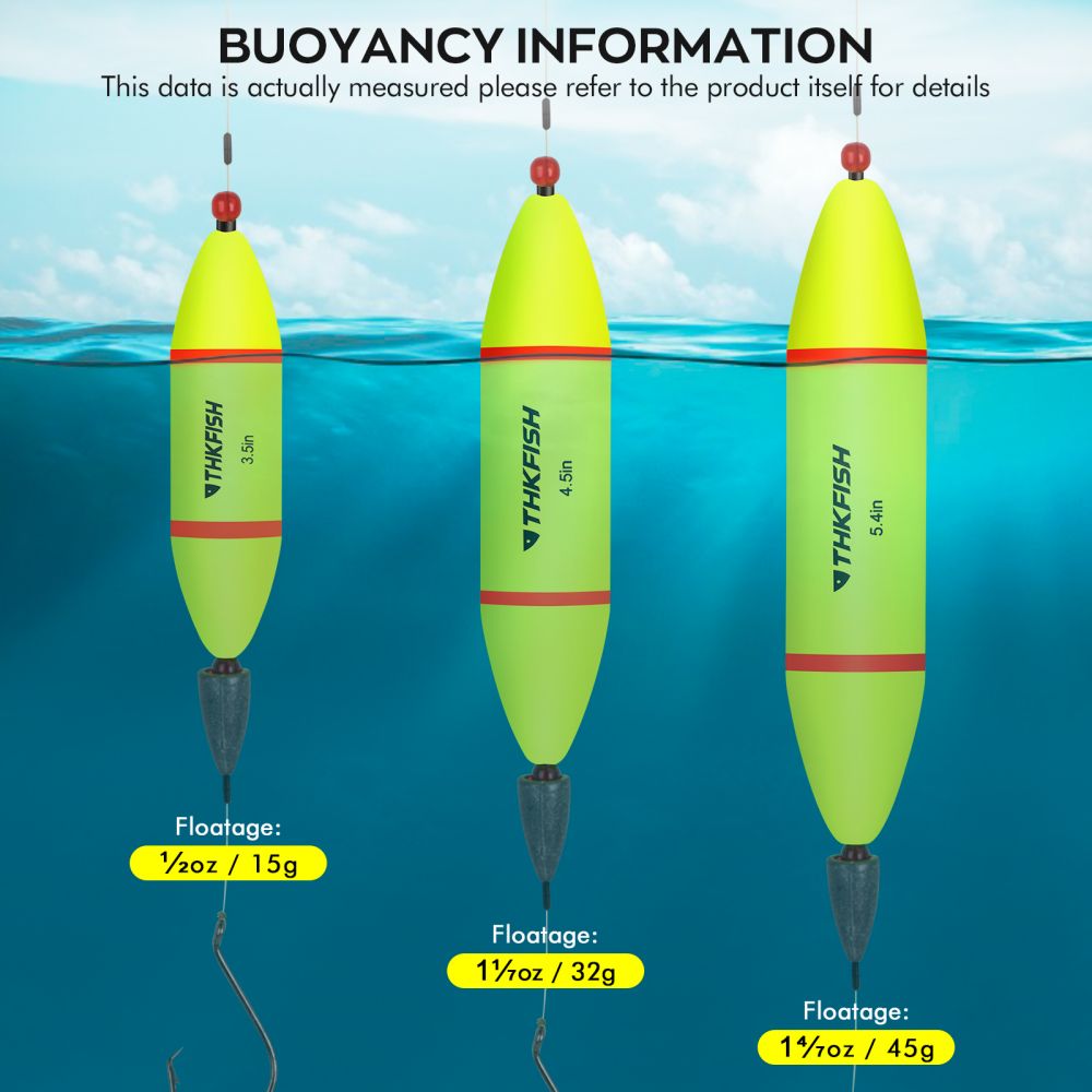3 Sizes and 8 Pieces: Each package contains 3 float sizes: 1/2 ounce (15 grams) - 0.9" x 3.5", 1-1/7 ounce (32 grams) - 1.07" x 4.5", 1-4/7 ounce (45 grams) - 1.14" x 5.4". These floats are available in red and yellow, with weights of 5.8 grams, 11.5 grams, and 12.2 grams, providing options to suit your fishing needs.