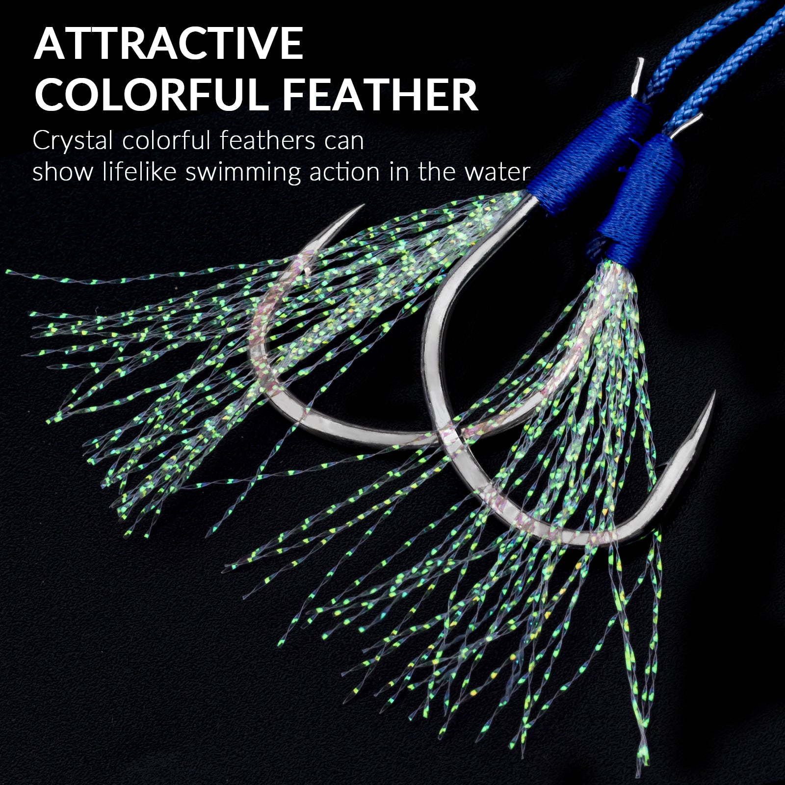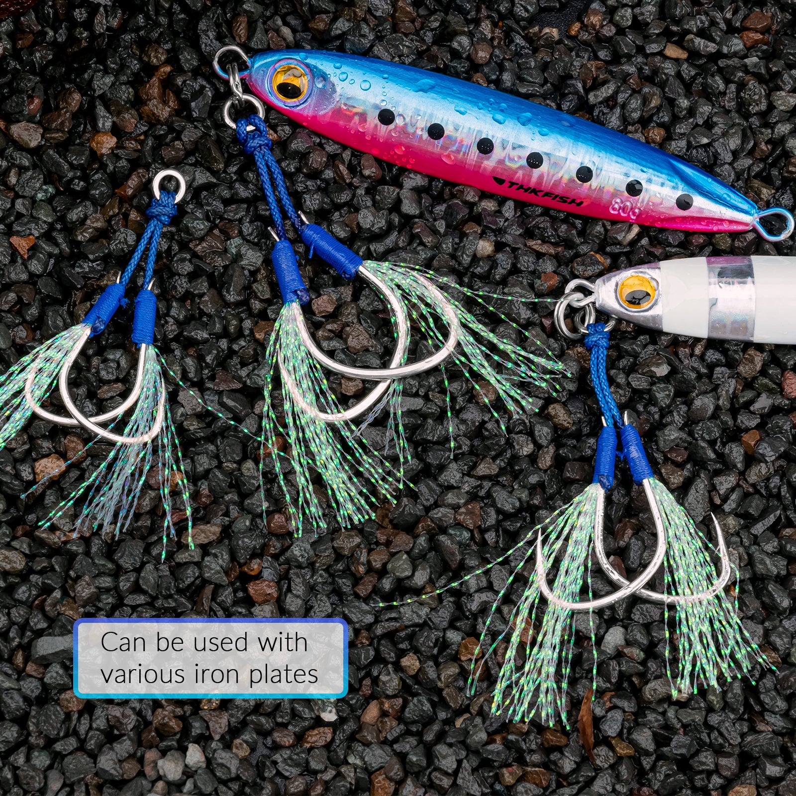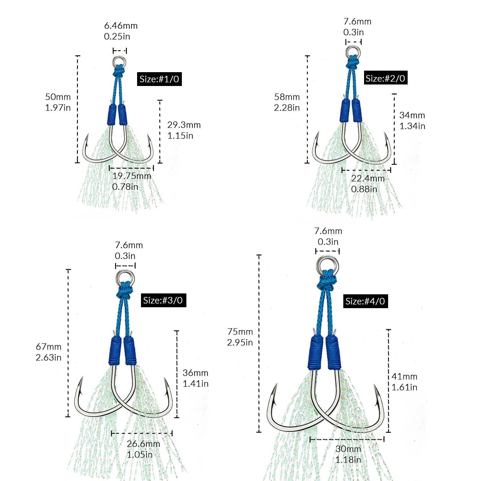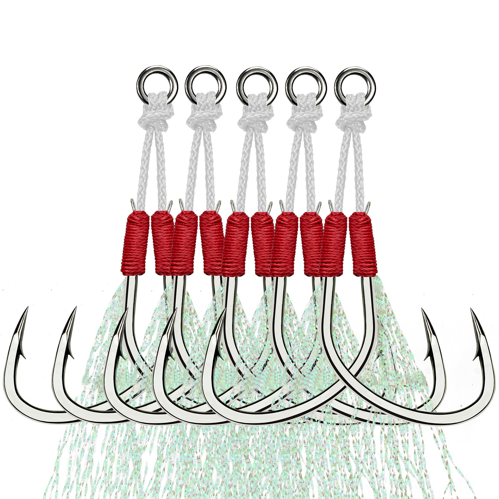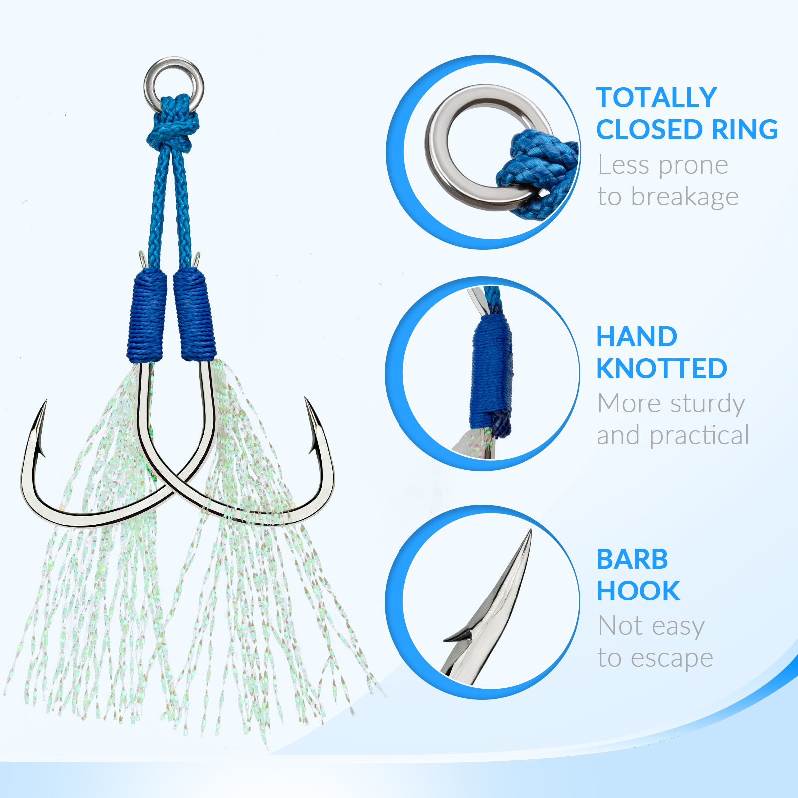 These jig assist hooks are suitable for various jigs such as vertical jigging lures, slow fall pitch jigs, Stinger Jigging jigs, and saltwater jigs. They can also replace treble hooks on bait. Widely used in sea fishing, they are excellent for targeting Tuna, Salmon, Striped Bass, jack, dogfish, and more saltwater species. Perfect for party boats, pier fishing, ice fishing, and other fishing adventures.