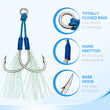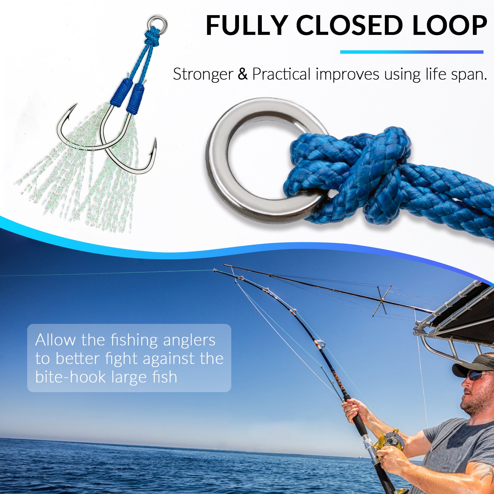 Our jigging double assist hooks are tightly secured with a manual winding knotting method at the hook handle, ensuring practicality and reliability. The use of multi-strand thick braided wire provides exceptional pulling force and resistance against fish bites, making these hooks ideal for targeting large fish with sharp teeth.