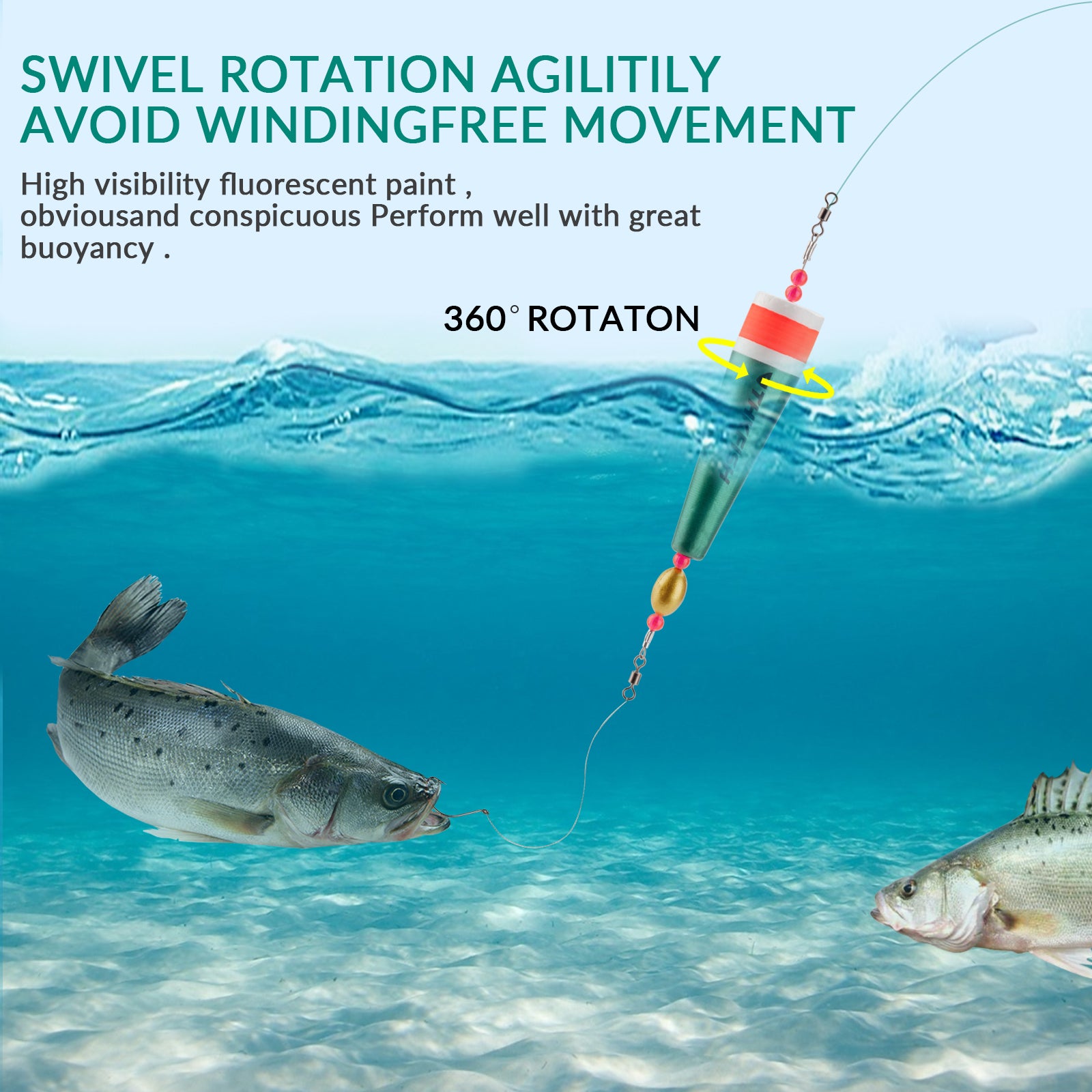 360° Flexible Rotation & Tangle-Free Design: Equipped with two swivels, these bobbers offer 360° rotation in the water, preventing tangles and allowing for smooth fishing. The stainless steel front wire ensures durability and elasticity, reducing the risk of knotting during fishing sessions.