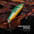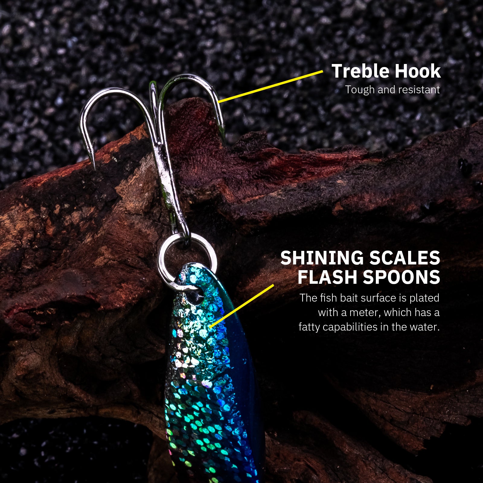High-Grade Finishing Process: Machined from premium materials, these spoons undergo a high-grade finishing process that includes buffing to a mirror-like luster and optical brightening. The result is a brilliant flash that attracts fish, while the durable and sharp hooks ensure long-lasting performance.