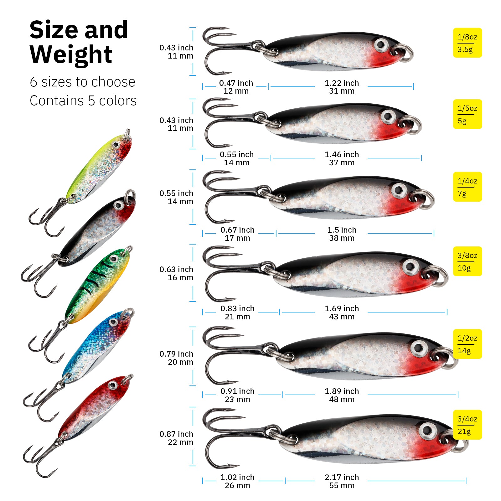 Versatile Design: Suitable for use with any fishing skill level and in various conditions, these spoons are versatile companions for anglers. Whether ice fishing or targeting Trout, bluegill, pike, panfish, sunfish, bass, striper, musky, or crappie, these spoons deliver exceptional results.