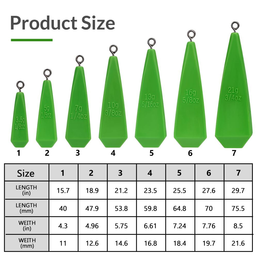 Clear Weight Indicator: Each practice plug features a clear weight indicator for added convenience. The plugs come in various weights to help you improve your casting skills. The package includes 7 different weights: 1/8oz, 1/5oz, 1/4oz, 3/8oz, 6/16oz, 5/8oz, and 3/4oz.
