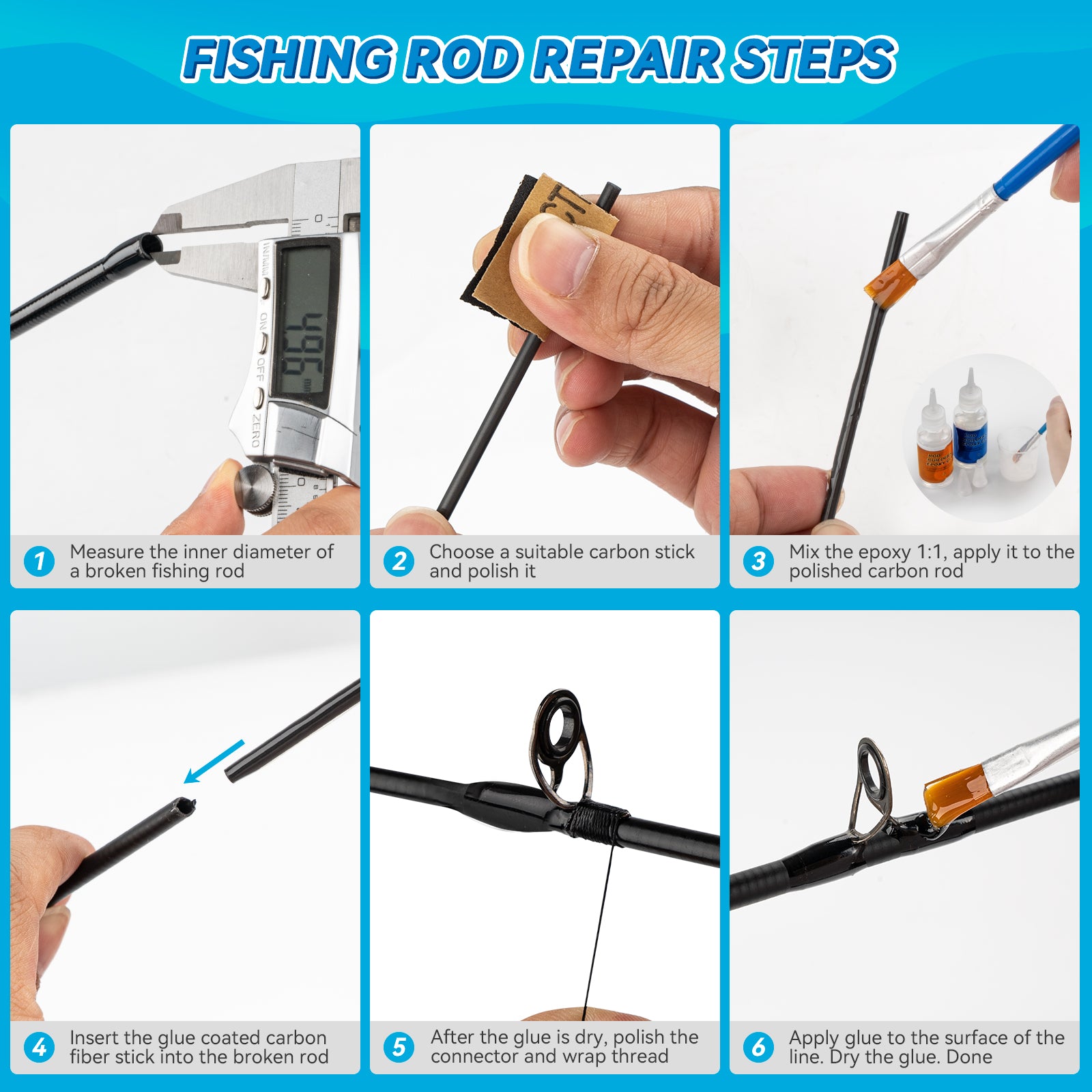 Quick Repair Process: Follow a simple process to repair your broken rod quickly. Measure the inner diameter of the broken rod, choose a suitable carbon fiber stick, polish it, apply epoxy glue, connect the broken parts, and secure them with thread and glue.