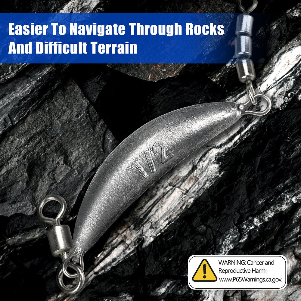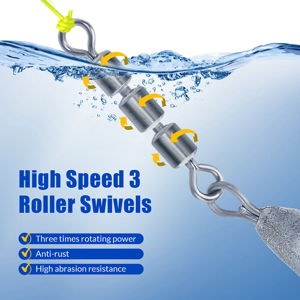 - High-Speed Swivel Rings: Each sinker is equipped with high-speed stainless steel swivel rings at both ends. The triple roller swivels provide exceptional rotational force and speed, preventing line twisting and tangling, even when fighting large fish.
