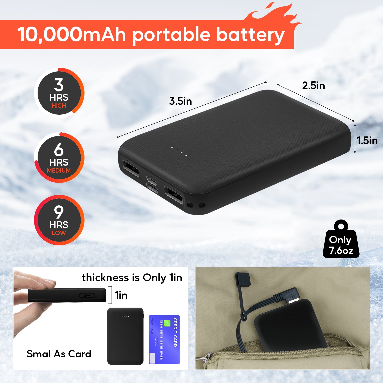- 【USB-Powered for Lasting Warmth】Our fishing costume heated vest for men with battery pack included Provides 10000mAh mobile power with 5V/2A output for supply. Plug in the mobile power, it only takes 10 seconds to supply heat easily, this men's and women's winter electric heated jacket can provide 8-9 hours of long-lasting warmth at low level, 5-6 hours at medium level, and 2.5-3 hours at high level.