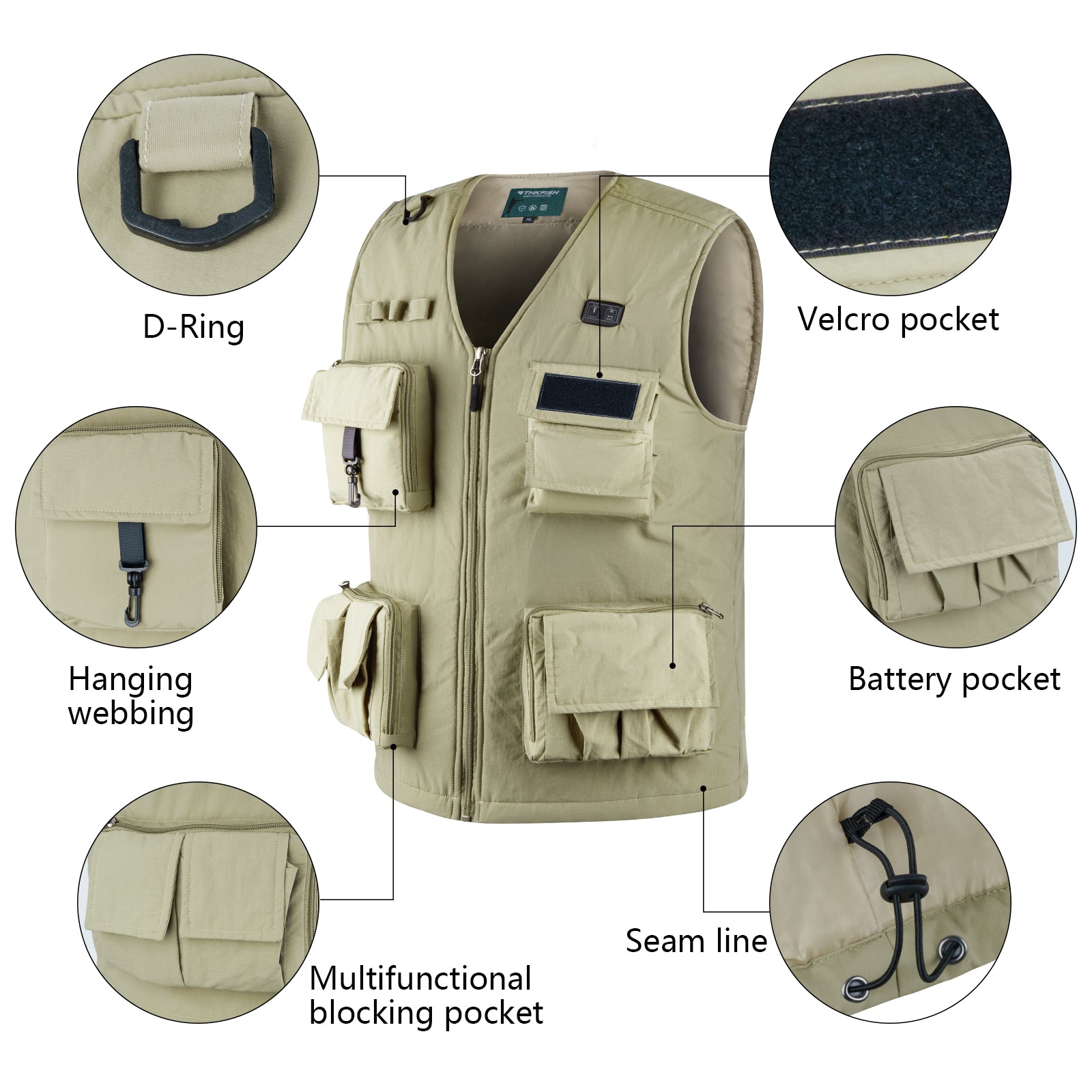 - 【Designed for Ice Fishing】The heated fishing vest is equipped with 9 functional pockets and fishing rod fixing loops, equipment connection buckles, rope loops, D-ring nets and hemostats, which is perfect for you to enjoy ice fishing activities in the ice fishing shelter, can accommodate ice fishing jigs, ice fishing rods, ice fishing gloves and other ice fishing gears, can keep your items well organized, it is a super practical men's ice fishing equipment.