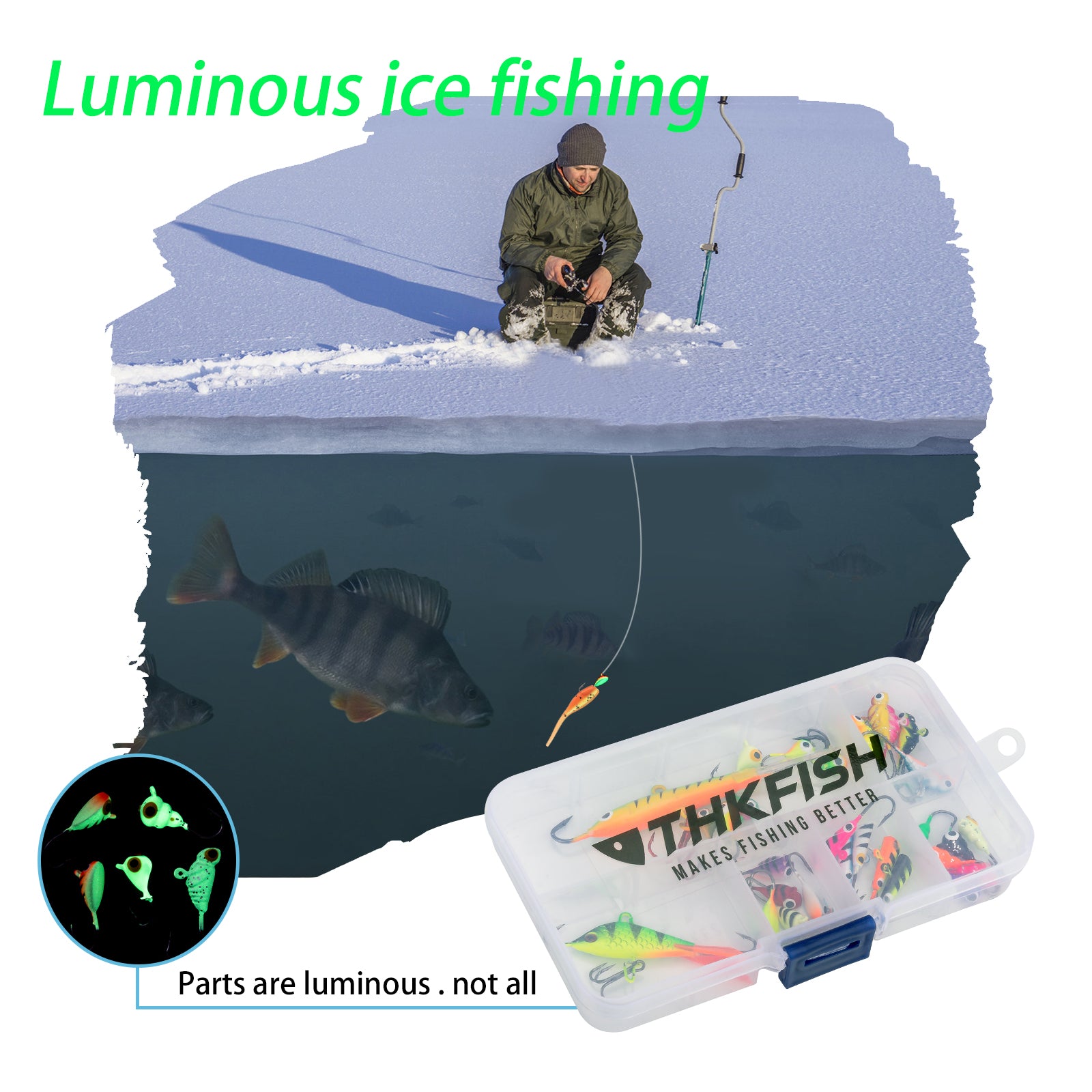 - ATTRACTIVE ICE FISHING LURES: Ice fishing jigs' realistic raised fin attachment, brilliant brightness and high fidelity paint coating make these crappies jigs lures more attractive. A parts of ice fishing jigs for walleye glow in the dark, not all. Glowing ice crappies jigs attract fish from farther and deeper spot.