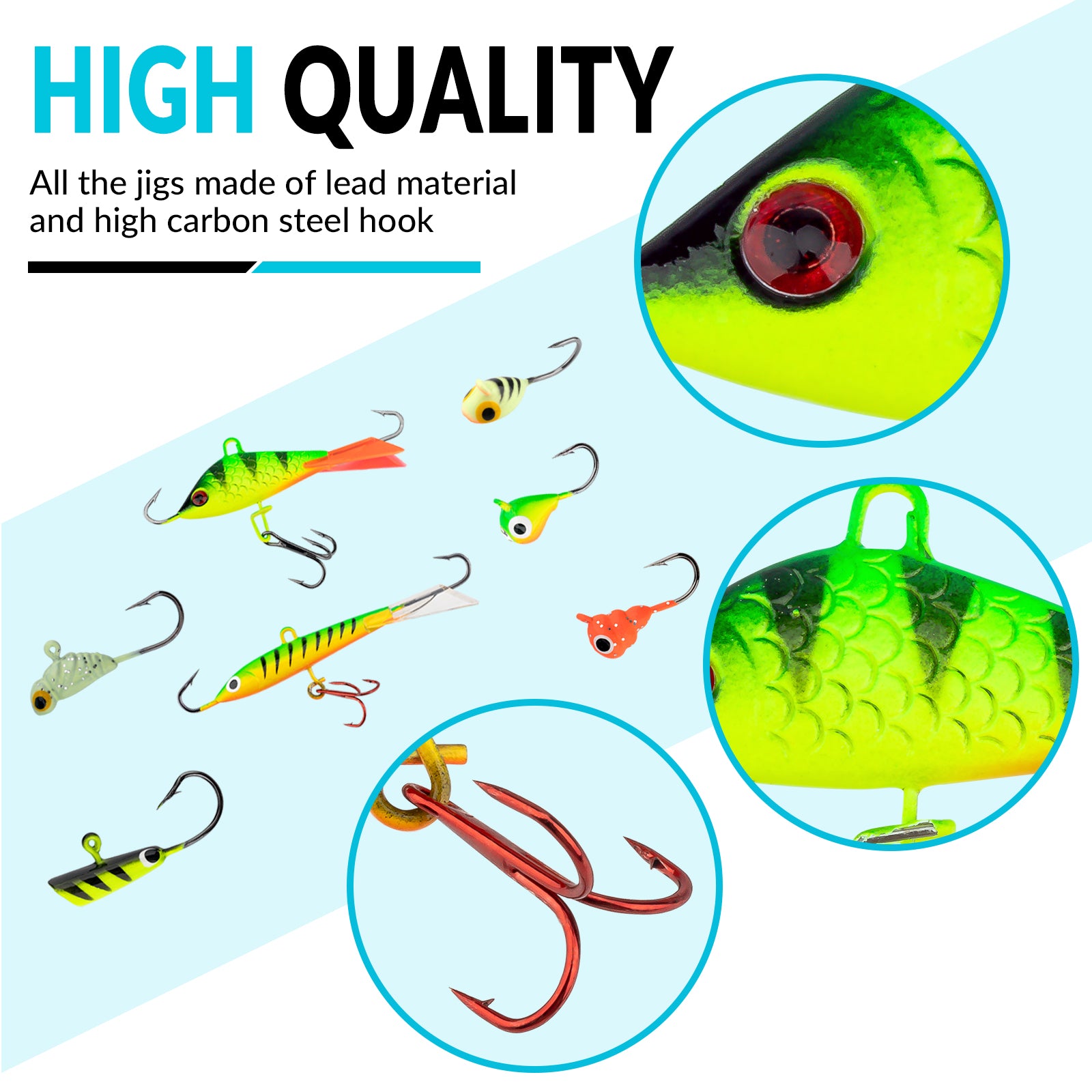 - MADE OF PREMIUM MATERIALS: All these ice fishing lures made of premium lead material and high carbon steel hook. Durable and Sharp, extremely penetrating hook tip allows for rapid stabbing of the upper jaw of the target fish. All these ice jigs packed in a plastic box. Easy to carry and storage.