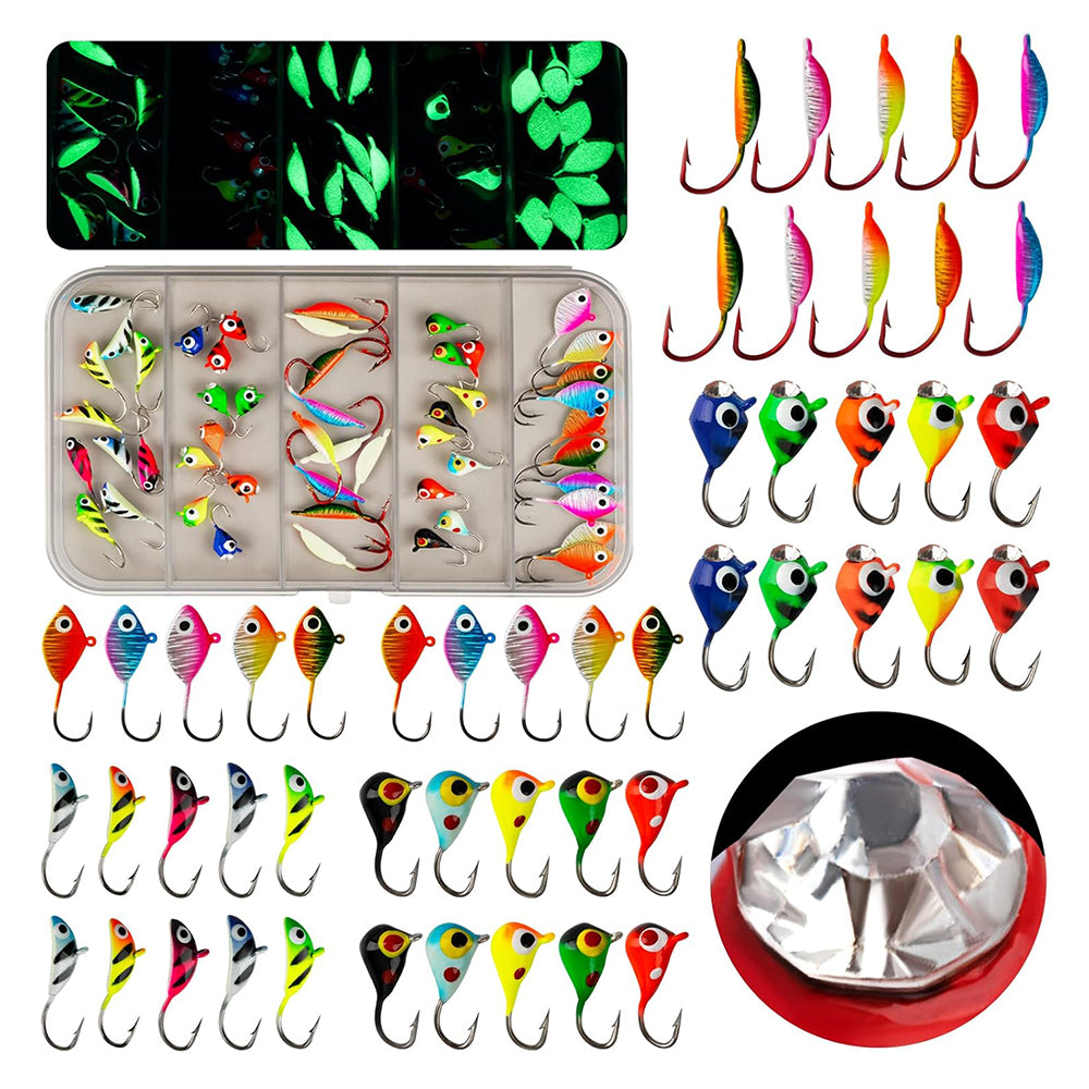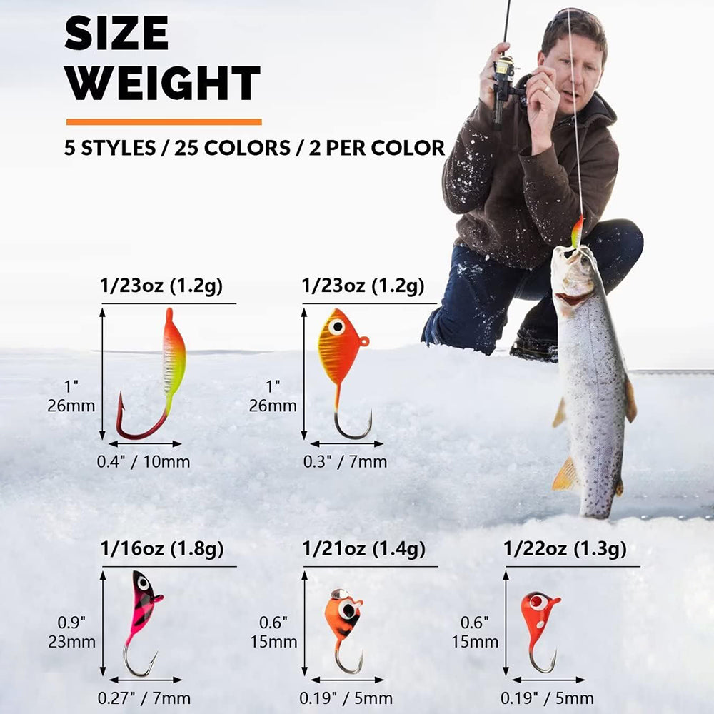 - AMAZING ICE FISHING KIT: Package included: 50pcs. These ice fishing jigs have different colors and size for you to choose. please refer to the picture for specific size. The varied shapes and high quality characteristics of these ice fishing walleye jigs make your ice fishing trip rewarding and full of surprises. If you have any problem, please contact our customer support and we will reply you within 24 hours.