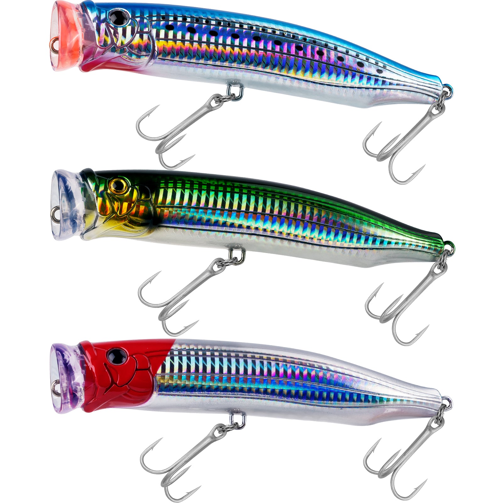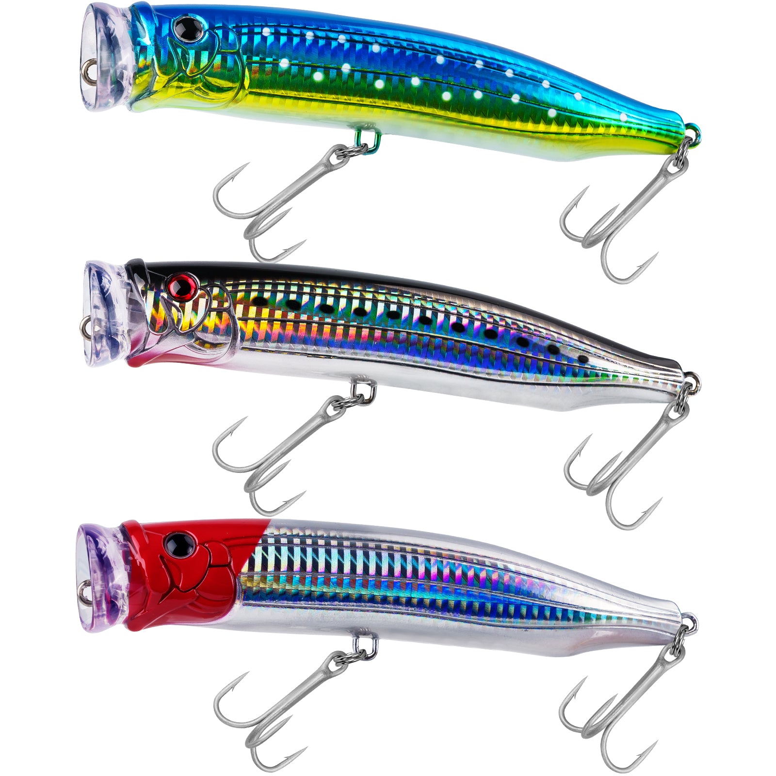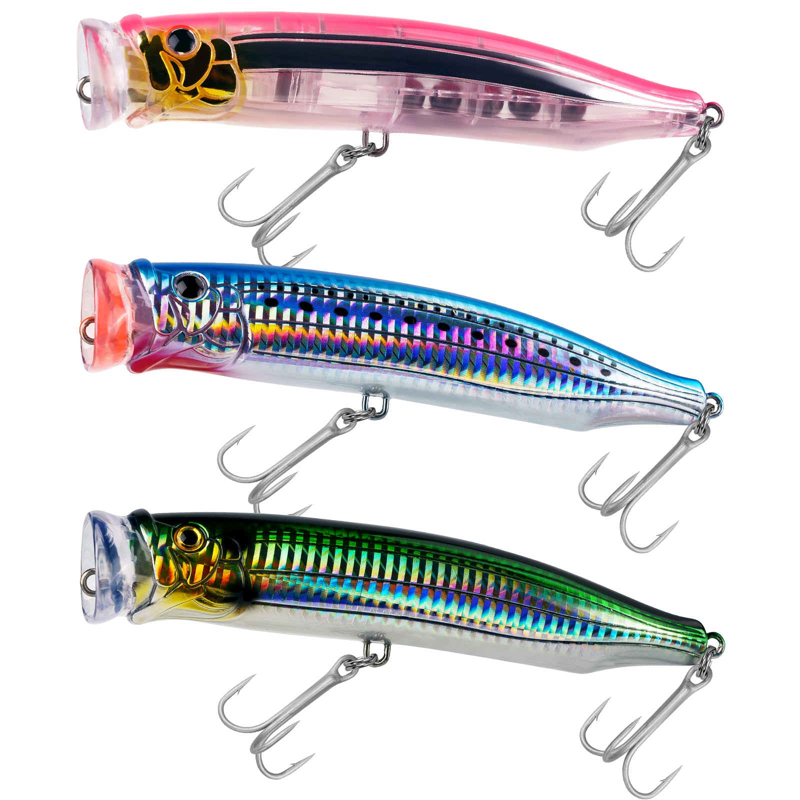 Wide Application: THKFISH Saltwater Popper Lures are versatile and suitable for inshore and offshore applications. They are effective for surfcasting for Striped Bass, Jack, or Roosterfish, as well as boat casting for Tuna, Shark, and Dorado. These lures target a variety of predator fishes such as bass, yellow perch, walleye, pike, muskie, trout, and more.
