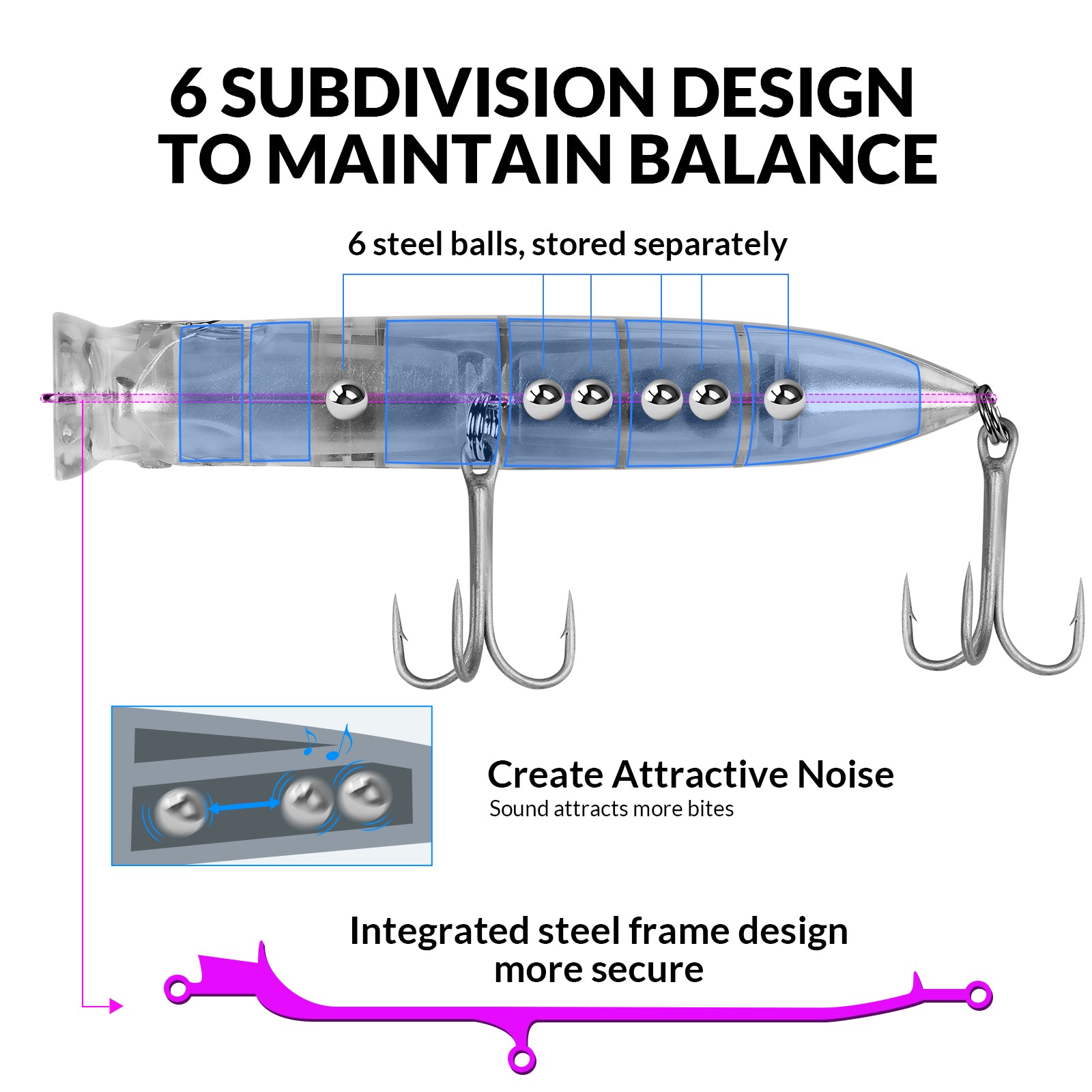Long-Distance Casting Design: The center of gravity of the steel ball in the lure facilitates stable and smooth aerial postures during casting, enabling long-distance casts with ease. The steel ball produces sound and the largemouth design creates splashes upon retrieval, attracting fish with both visual and auditory stimuli.