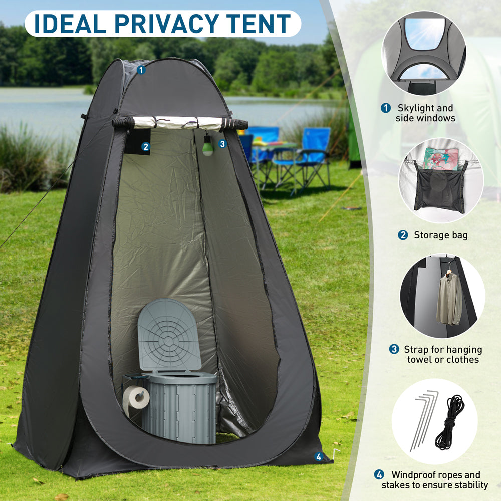 Stable and Privacy Tent: The camping toilet tent is constructed with anti-tear 190T polyester material for durability and stability. It comes with windproof ropes and stakes for added stability. The tent features a double-zipper door, side pockets, towel strap, skylight, and side windows for privacy, convenience, air circulation, and visibility.
