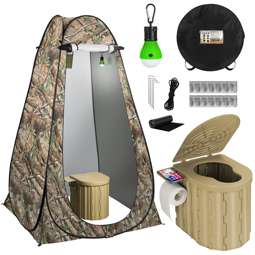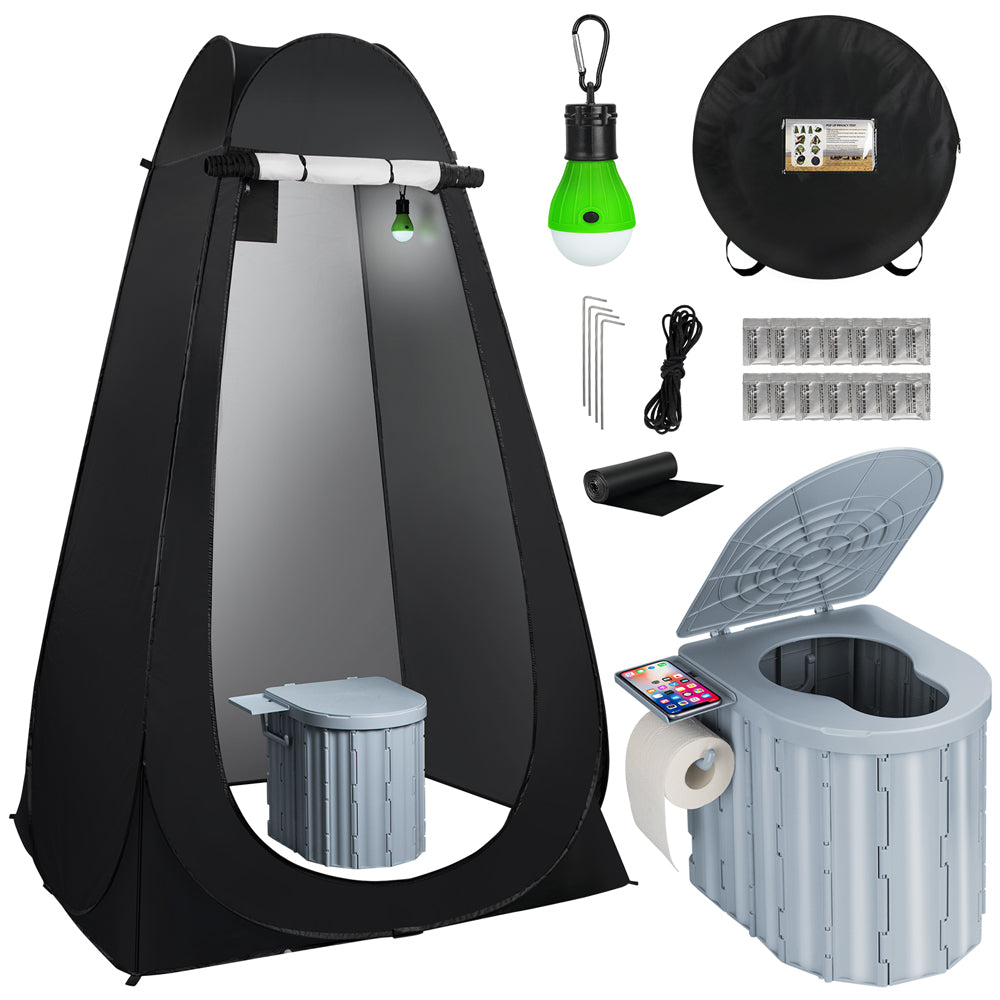 5-in-1 Kit: Includes a 6.2ft tall privacy tent with ropes and stakes, a foldable toilet, LED camping light (batteries not included), 12 garbage bags, 12 liquid waste gel packets, 1 toilet storage bag, and 1 camping tent backpack.