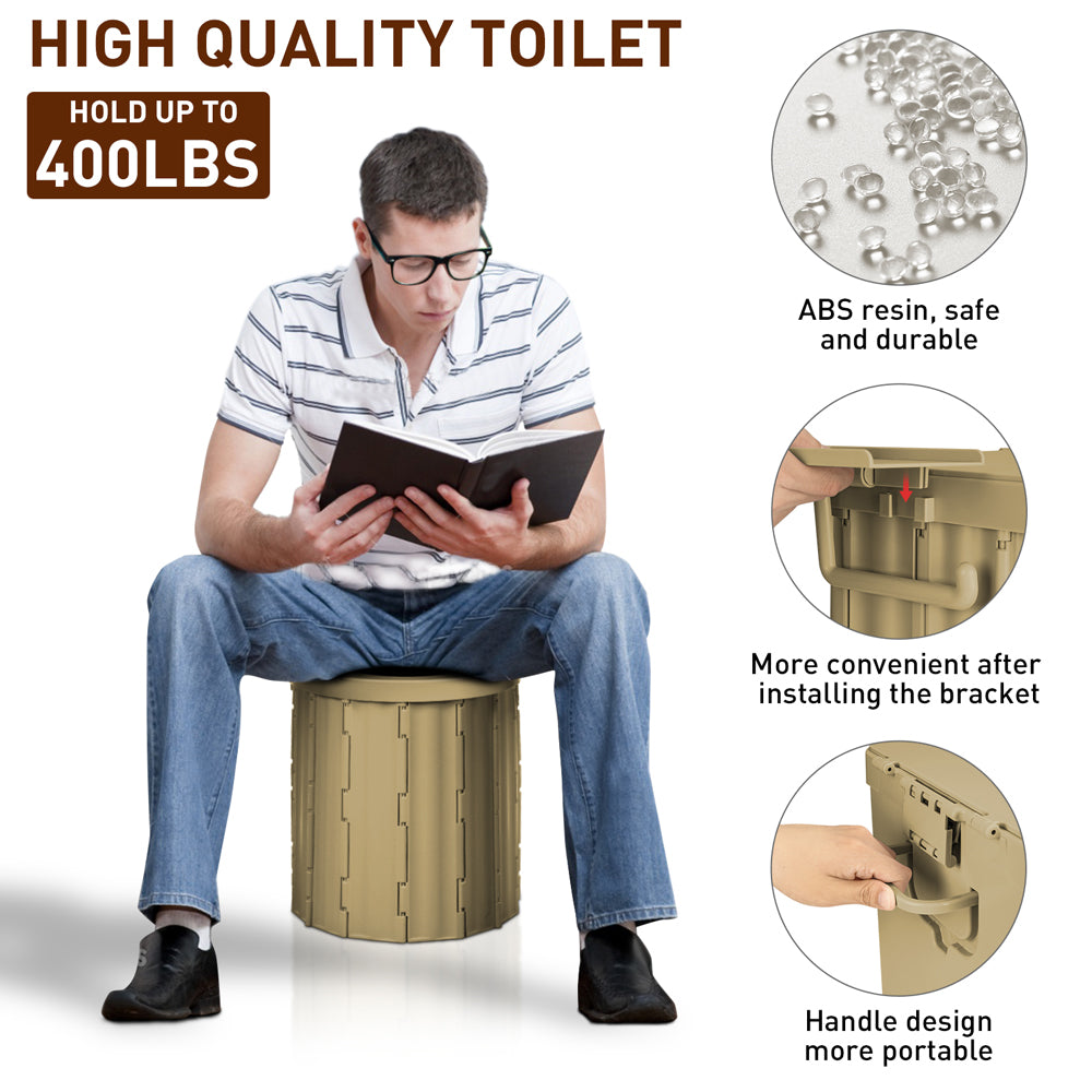 Comfortable Sitting Toilet: The portable toilet is made of sturdy ABS material and has an elevated height of 14.5" for comfortable sitting. It has a maximum weight capacity of 400 LBS, suitable for adults and kids. The toilet comes with 12 garbage bags and 12 liquid waste gel bags for easy cleaning and maintenance.
