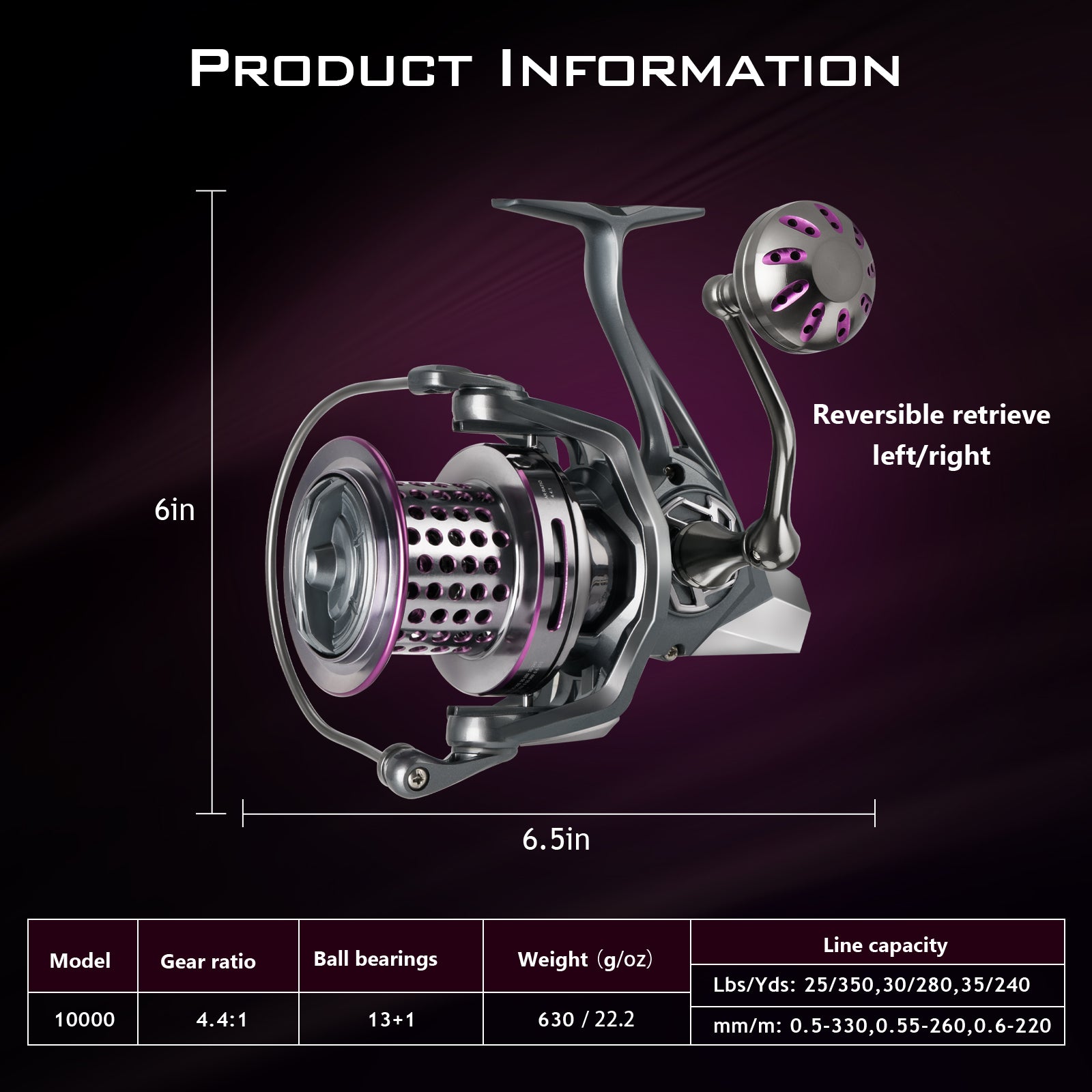 Model XF-10000 with a gear ratio of 4.4:1 and reversible retrieve left/right. Line capacity: 25/350, 30/280, 35/240 lbs/yds; mm/m: 0.5-330, 0.55-260, 0.6-220. Weighs approximately 630g/22.2oz.