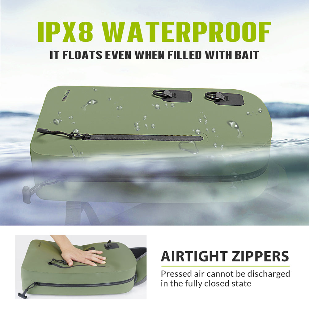 Airtight Zippers: The main compartment of the waterproof fishing backpack features a fully waterproof TRU airtight zipper with an IPX8 waterproof rating. Ensure the zipper is fully closed and press on the outside before submerging the backpack in water to check for air leakage.